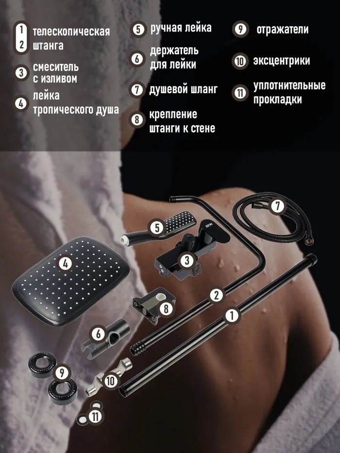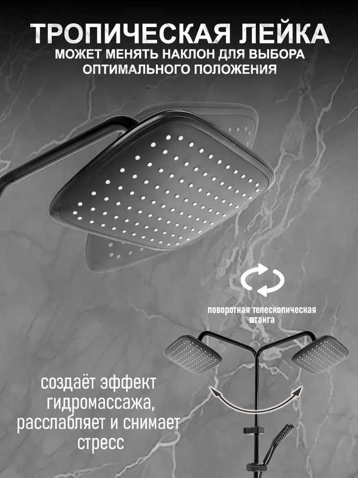 Душевая система ZEIN Z3869, смеситель, тропическая и ручная лейка, алюминий, черная — Характеристики