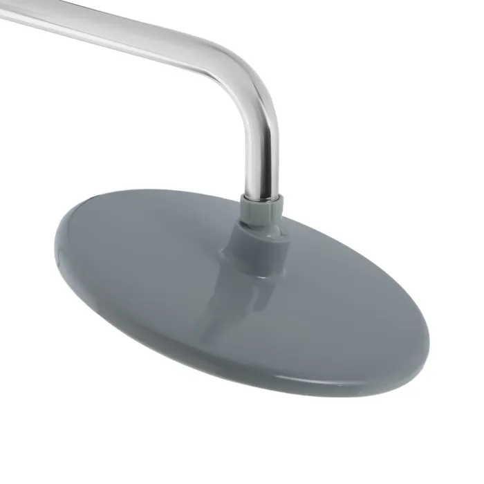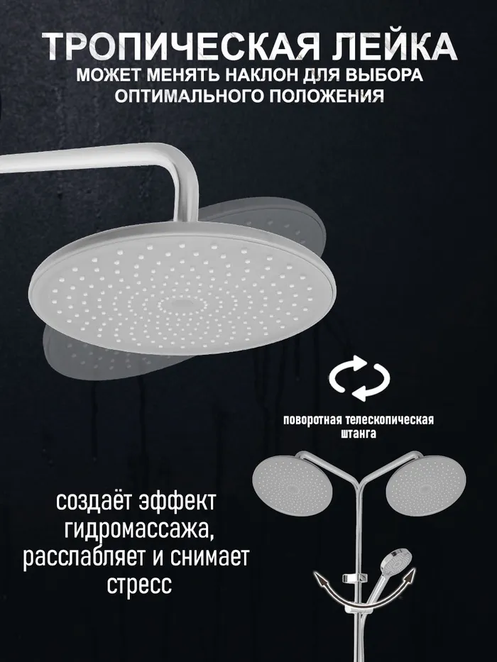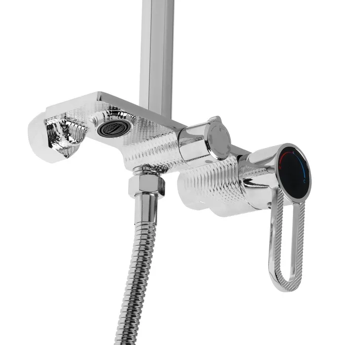 Конструкция фиксируется на стене. Модель оснащена смесителем с изливом, встроенным в корпус. На штанге расположен держатель для лейки со шлангом. Сверху находится тропическая лейка.