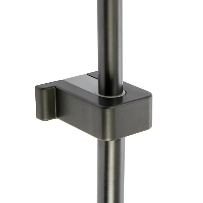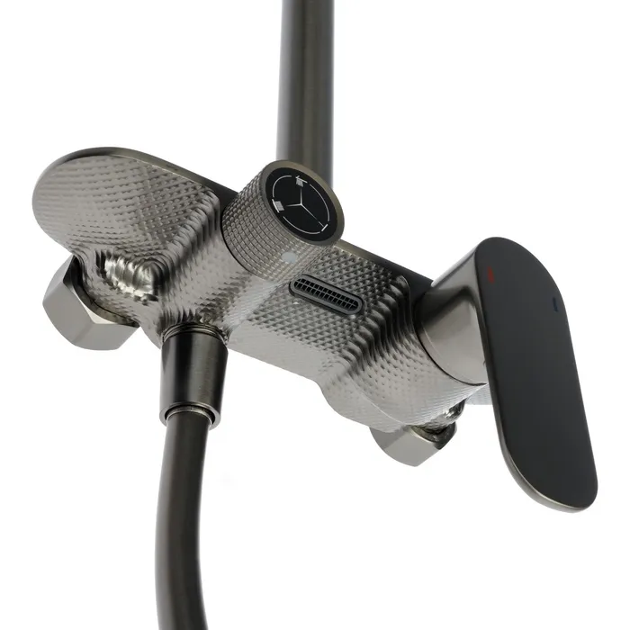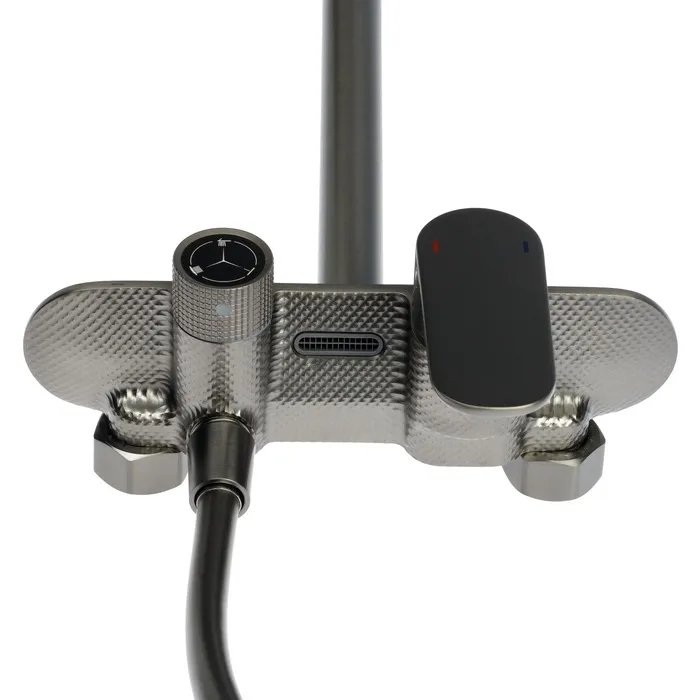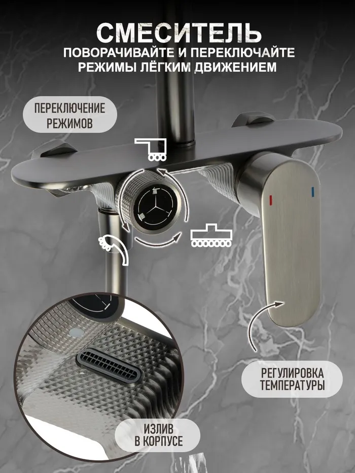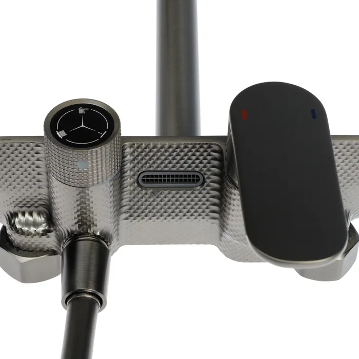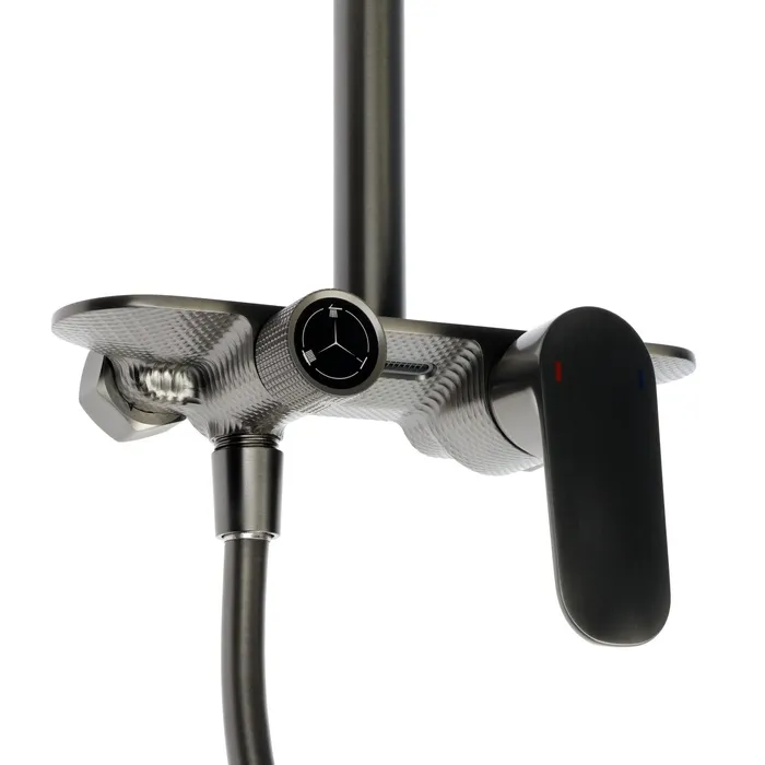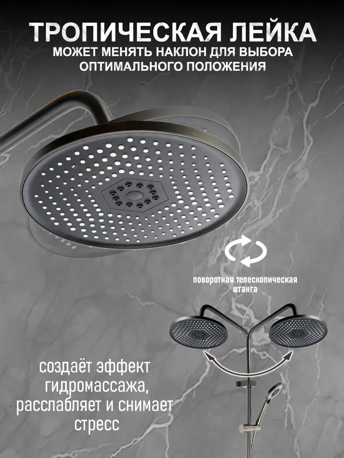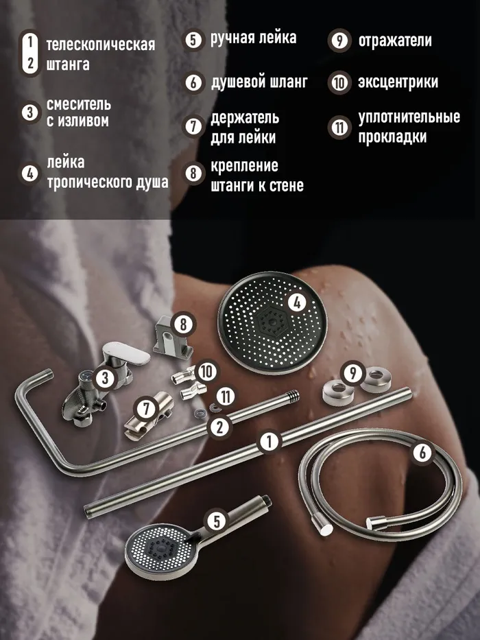 Конструкция фиксируется на стене. Модель оснащена смесителем с изливом, встроенным в корпус. На штанге расположен держатель для лейки со шлангом. Сверху находится тропическая лейка.