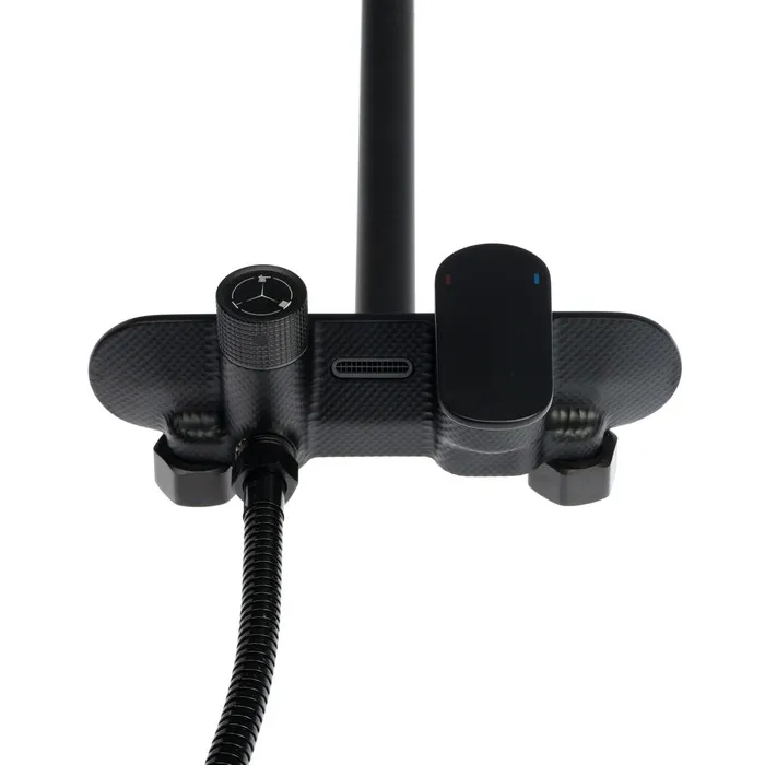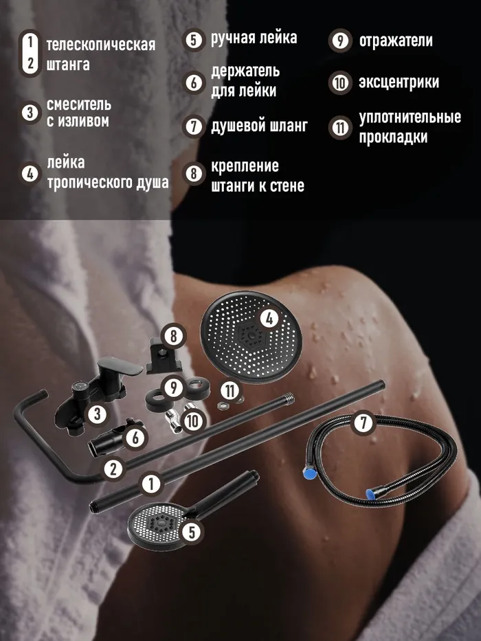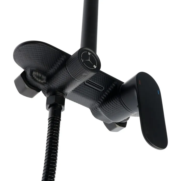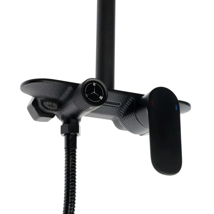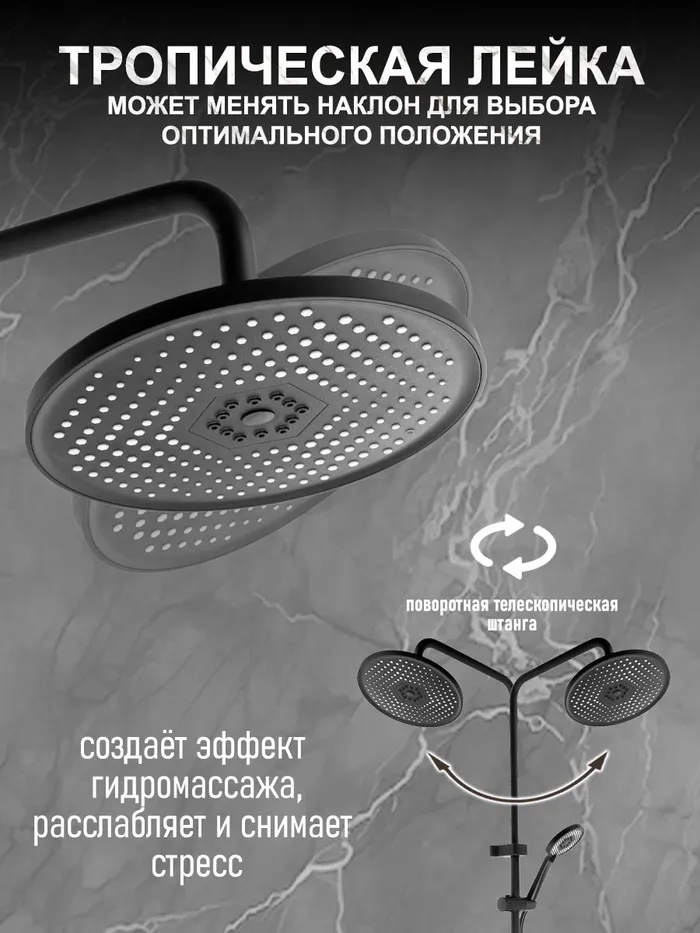 Конструкция фиксируется на стене. Модель оснащена смесителем с изливом, встроенным в корпус. На штанге расположен держатель для лейки со шлангом. Сверху находится тропическая лейка.
