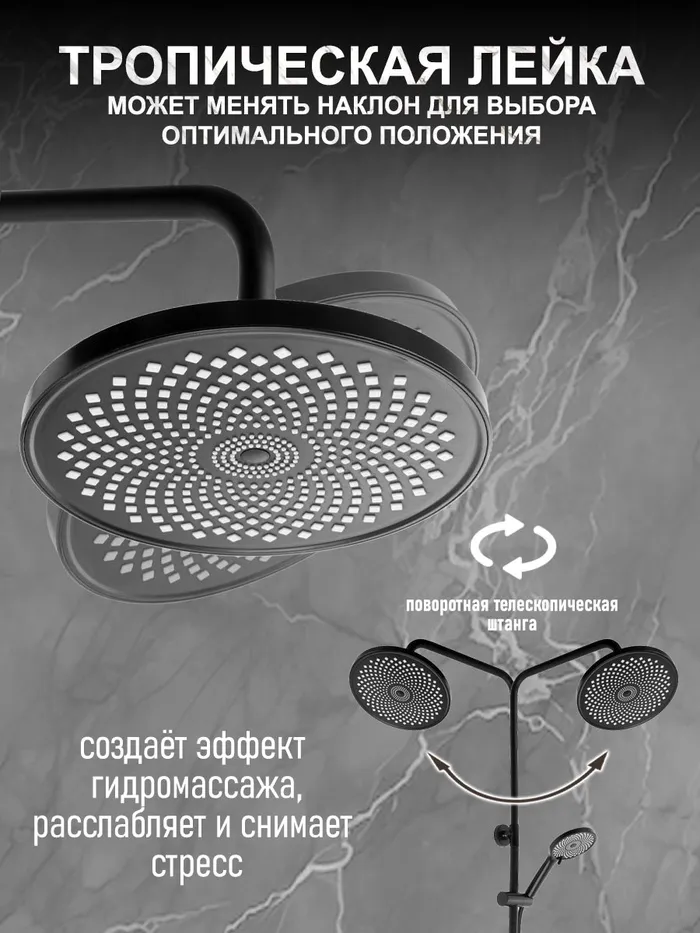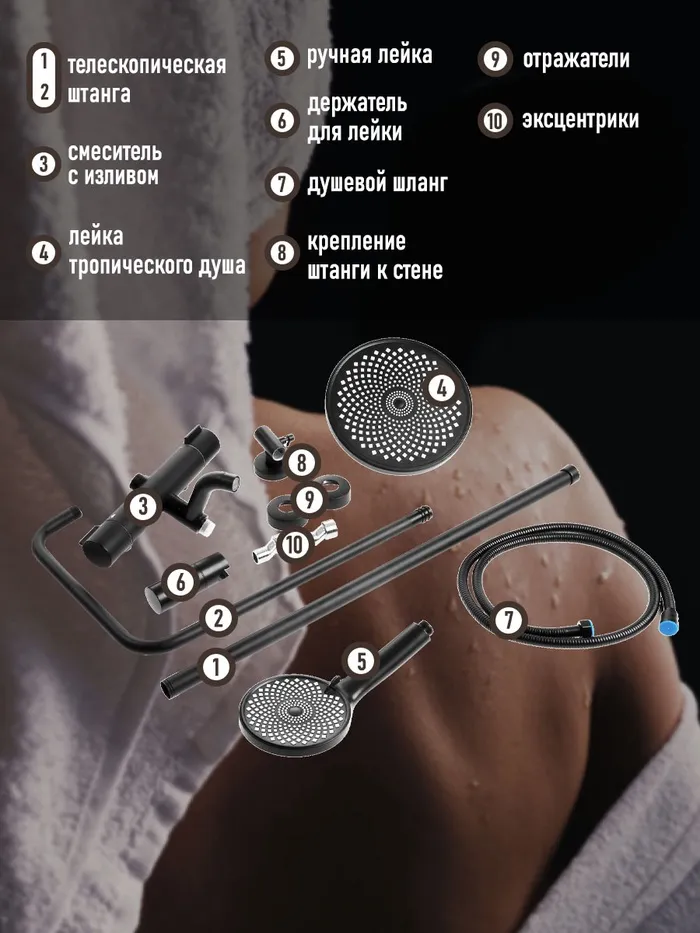 Конструкция фиксируется на стене. Модель оснащена смесителем с изливом. На штанге расположен держатель для лейки со шлангом. Сверху находится тропическая лейка.