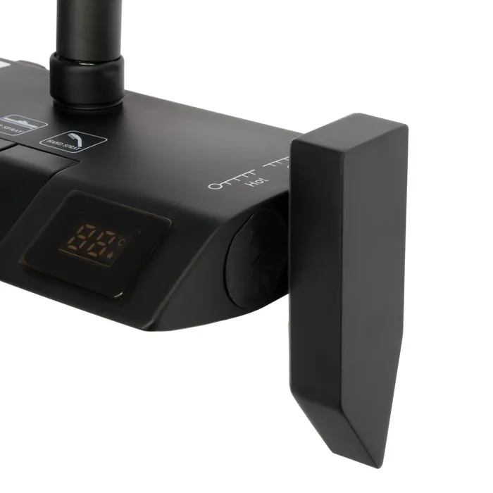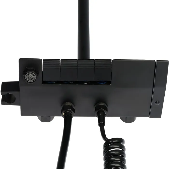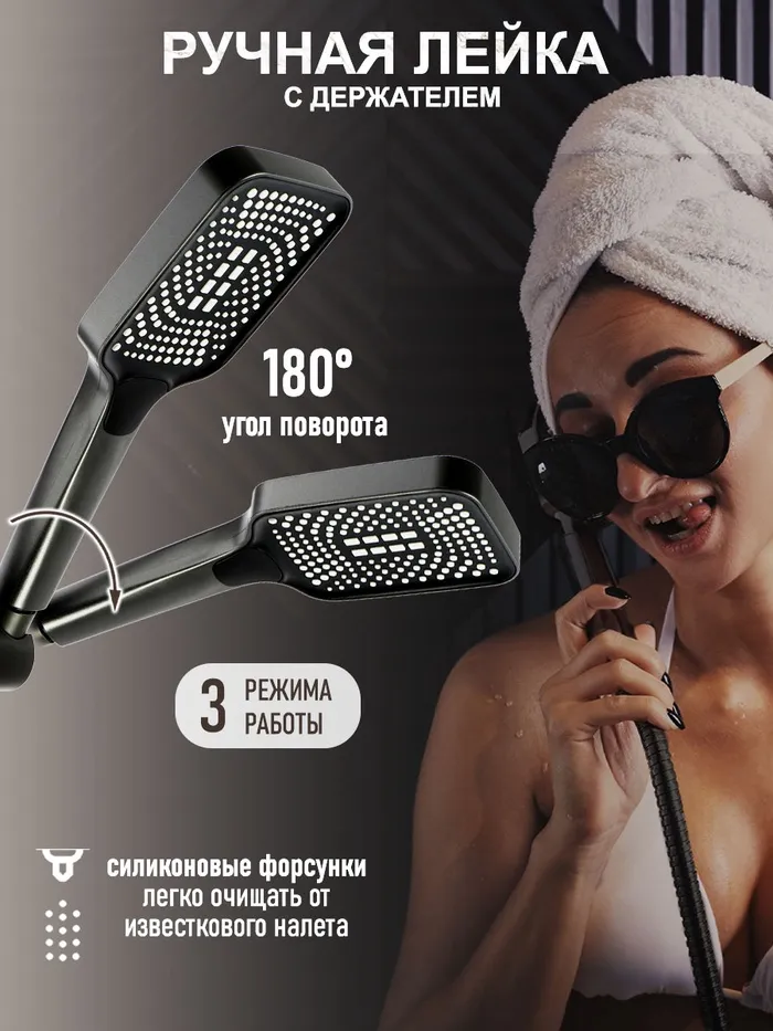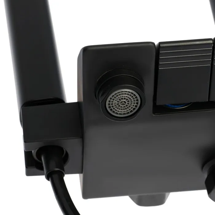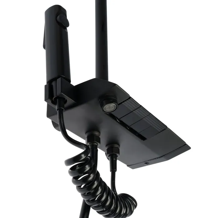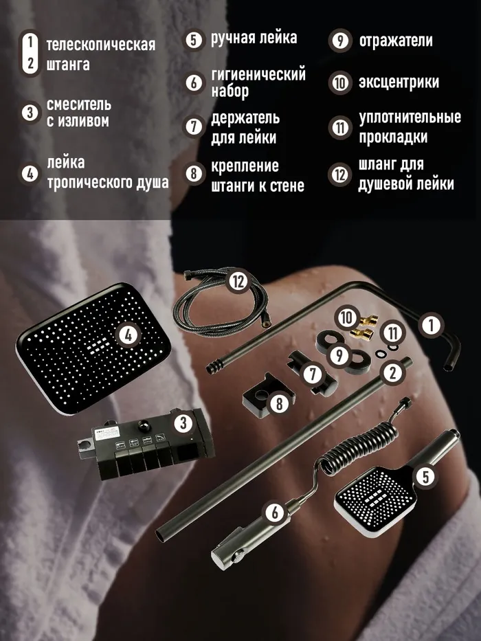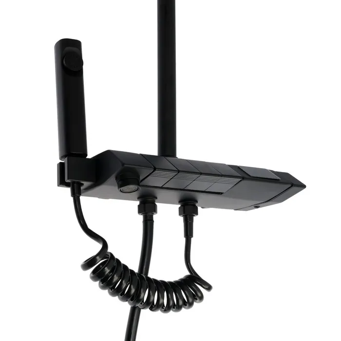 Конструкция фиксируется на стене. Модель оснащена смесителем с изливом, встроенным в корпус. На штанге расположен держатель для лейки со шлангом. Сверху находится тропическая лейка.
