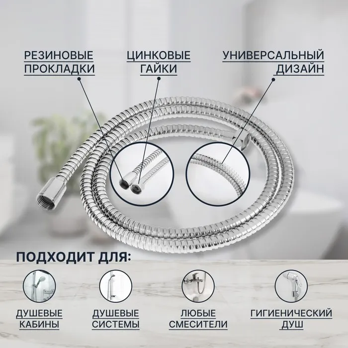 Шланг изготовлен из ПВХ в сочетании с оплеткой из нержавеющей стали двойного зажима. Длина душевого шланга составляет 1,5 метра, присоединительный размер 1/2" (полдюйма), подключение к смесителю происходит с помощью обычной накидной гайки, а к лейке - конусной накидной гайки.
