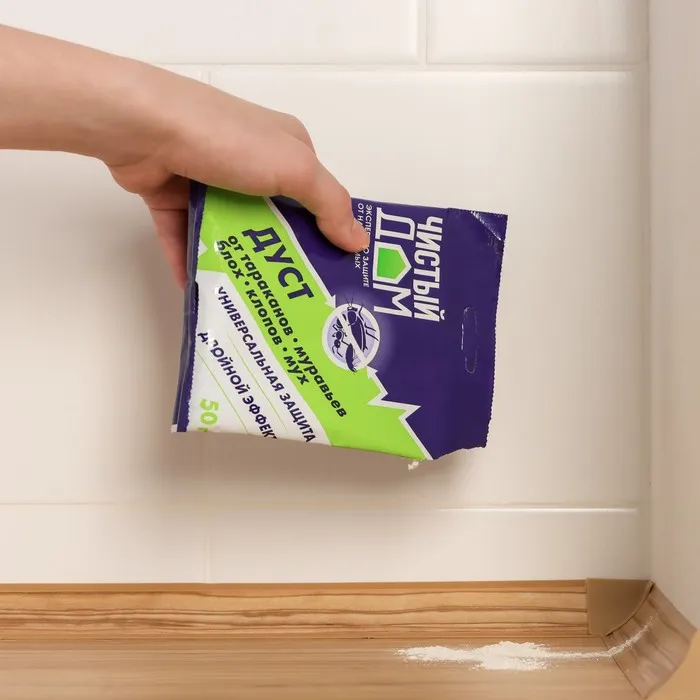 - Простота применения: Порошок легко наносится в местах скопления насекомых — вдоль плинтусов, возле мусорных вёдер, в щелях и других труднодоступных местах.