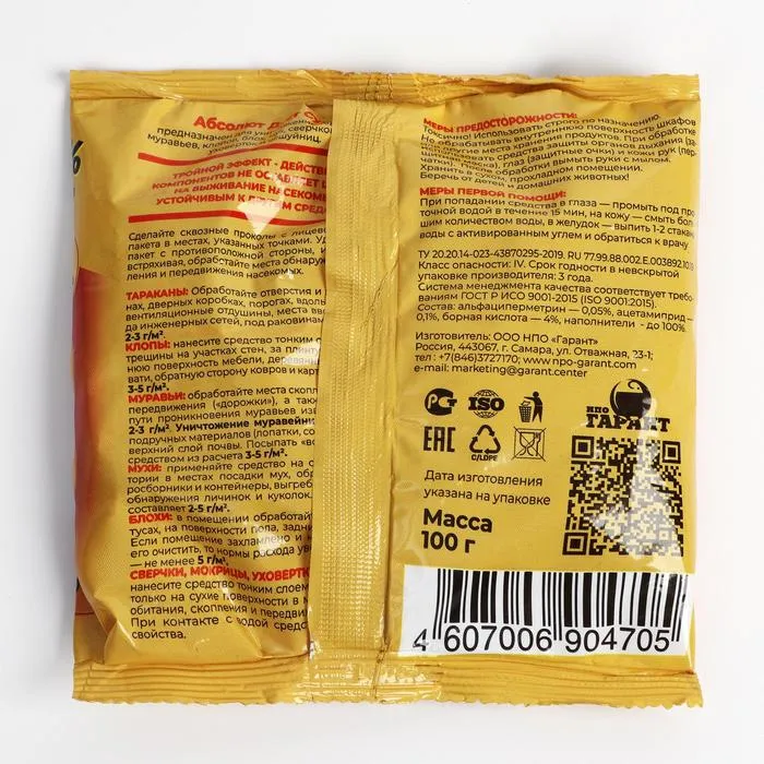 Дуст от насекомых "Абсолют супер", пакет, 100 г — Характеристики