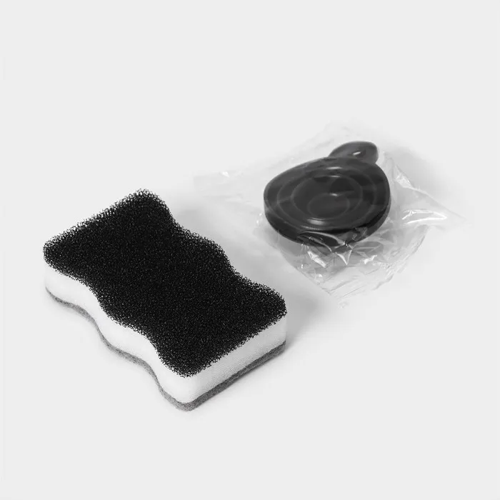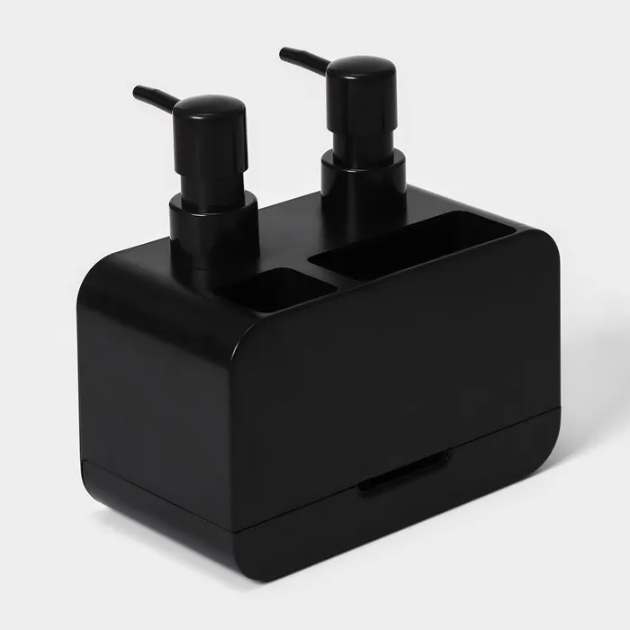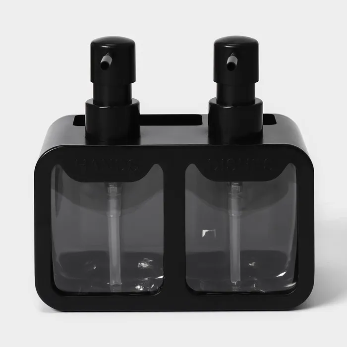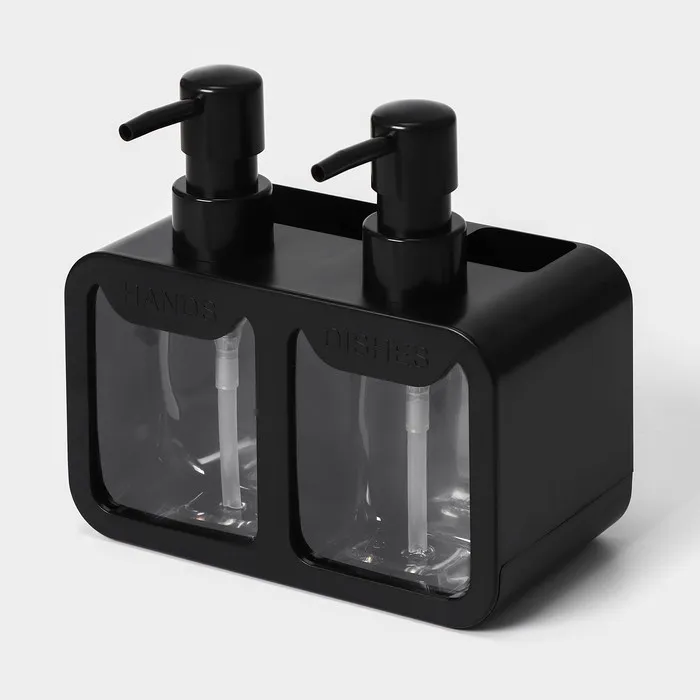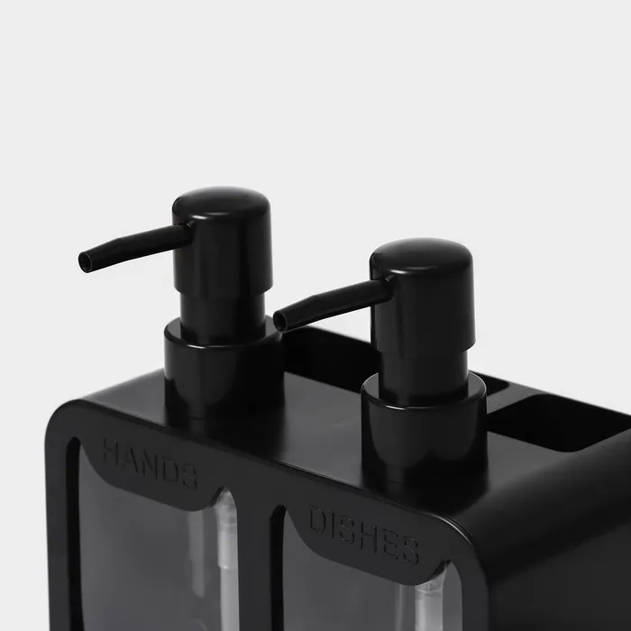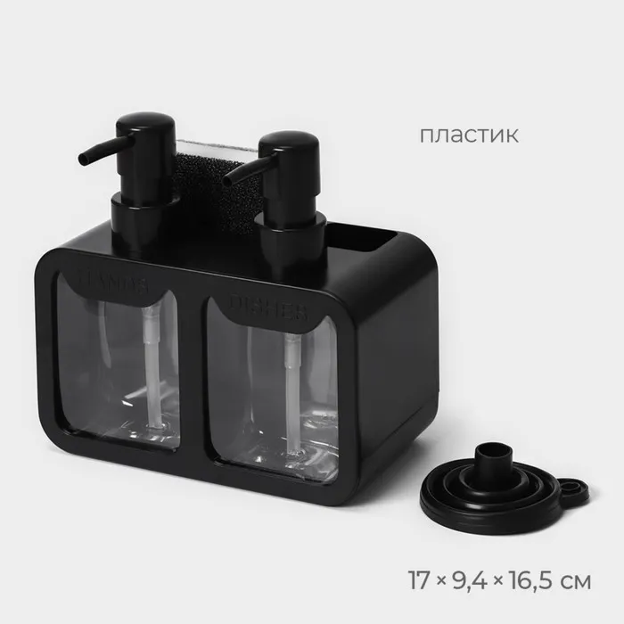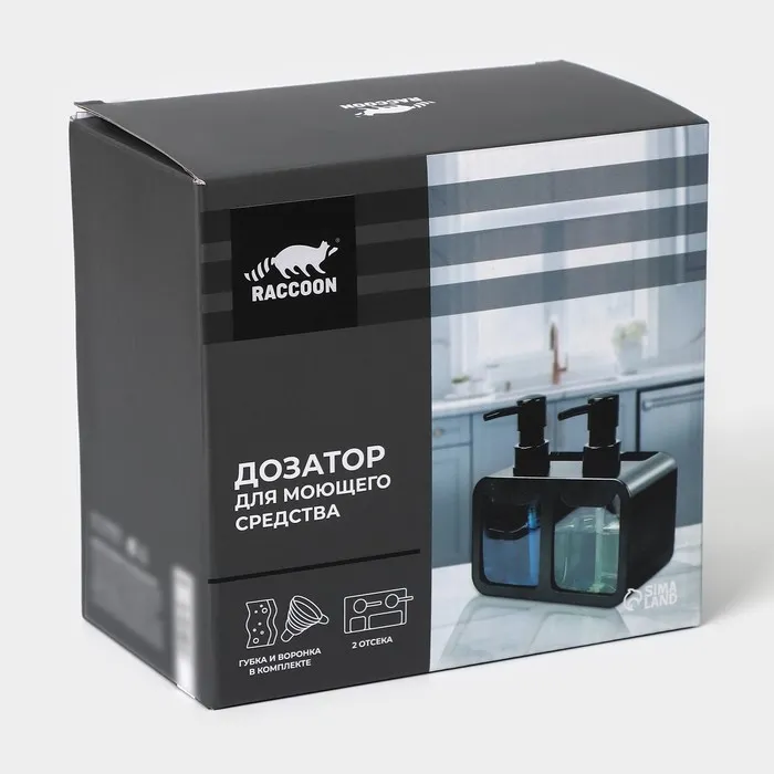 Двойной дозатор для мыла и моющего средства Raccoon, с губкой в комплекте, по 300 мл, цвет чёрный — Характеристики