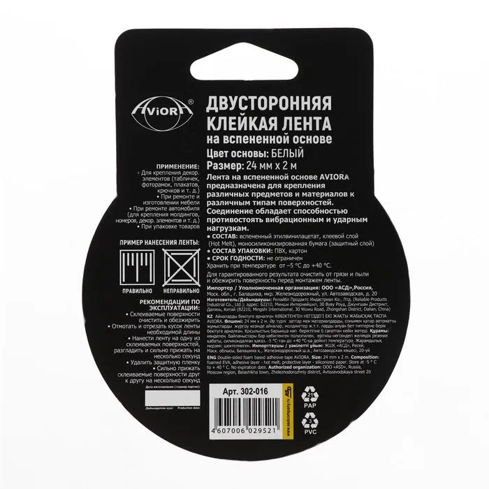 Двусторонняя вспененная лента Aviora, сплошная, 24 мм, 2 м — Характеристики