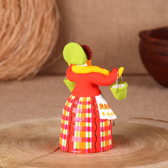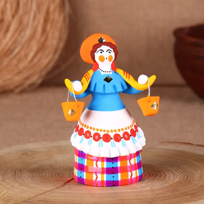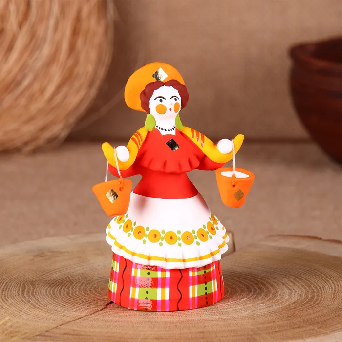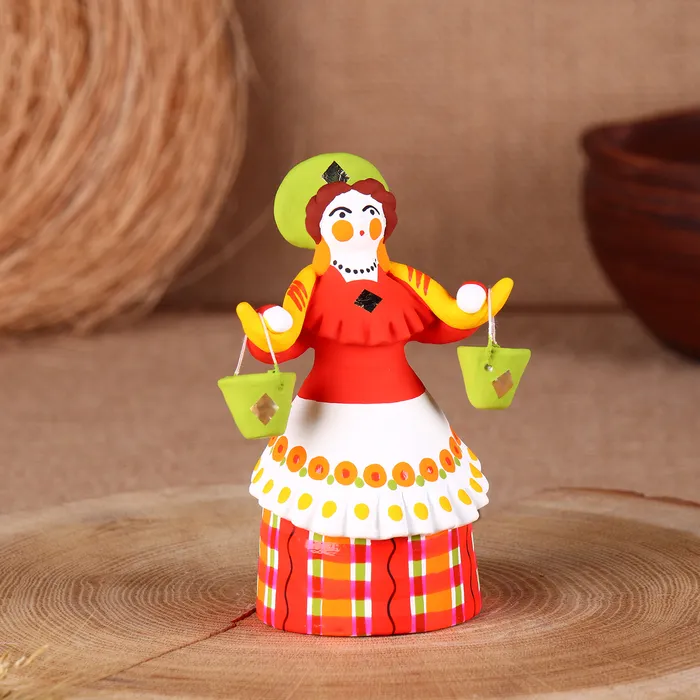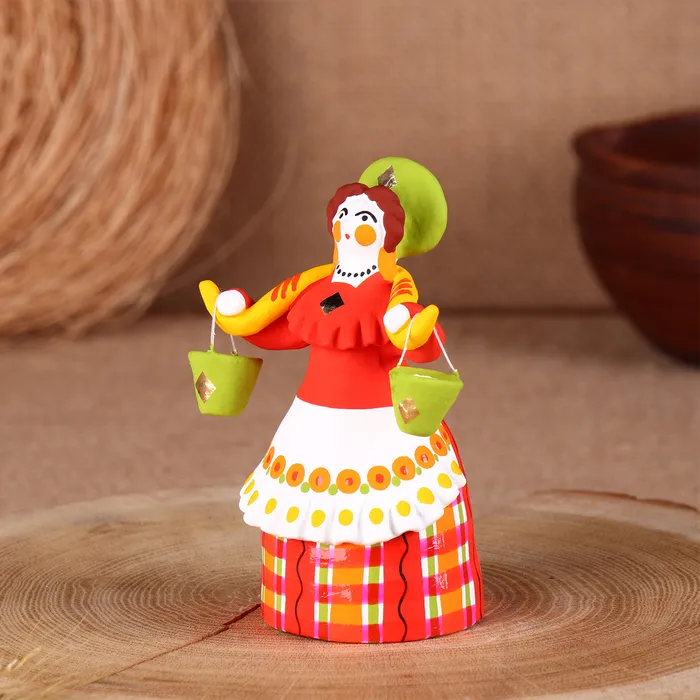 Перед вами оживает частица русского народного искусства — глиняная фигурка, воплощающая образ жизнерадостной барыни с коромыслом. В этой 15-сантиметровой красавице с пышными формами и ярким сарафаном мастерски передана вся самобытность знаменитого дымковского промысла.