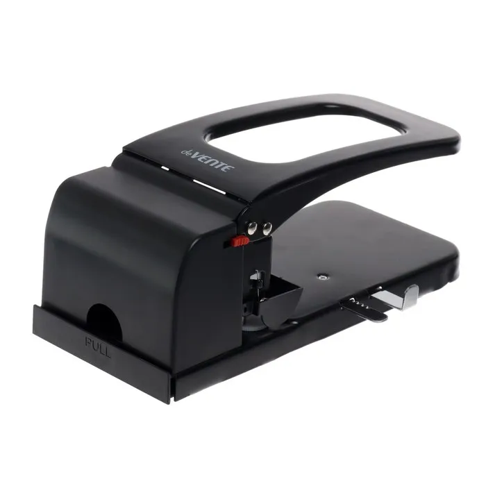 Дырокол большой мощности "deVENTE" (100 листов) металлический, с 2-мя встроенными металлическими линейками, съемным металлическим поддоном для конфетти и механизмом для регулировки глубины закладки, с возможностью замены марзанов, пуансонов, планки и механизма для регулировки глубины закладки, в картонной коробке, черный.