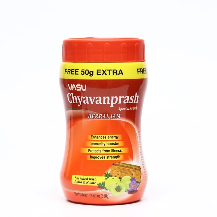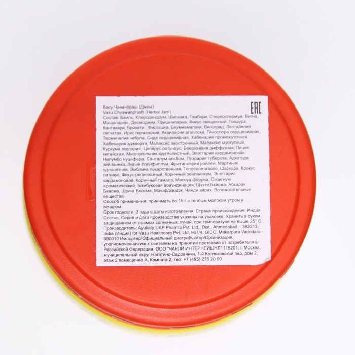 Chyawanprash от бренда Vasu – многокомпонентная джемообразная смесь, состоящая из огромного количества полезных трав, плодов, ягод, витаминов и минералов. Сверху джема имеется серебряная пленочка, которая является естественным консервантом. Ее необходимо смешать с джемом. Чаванпраш считается одним из самых эффективных средств в Аюрведе, которое оздоравливает, тонизирует и омолаживает все органы и системы.