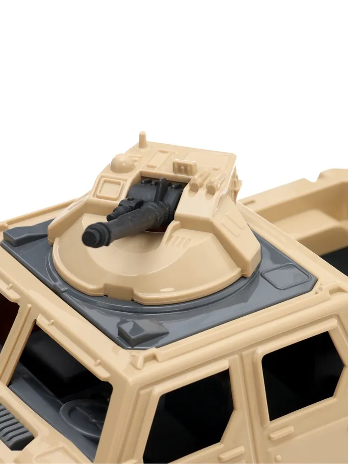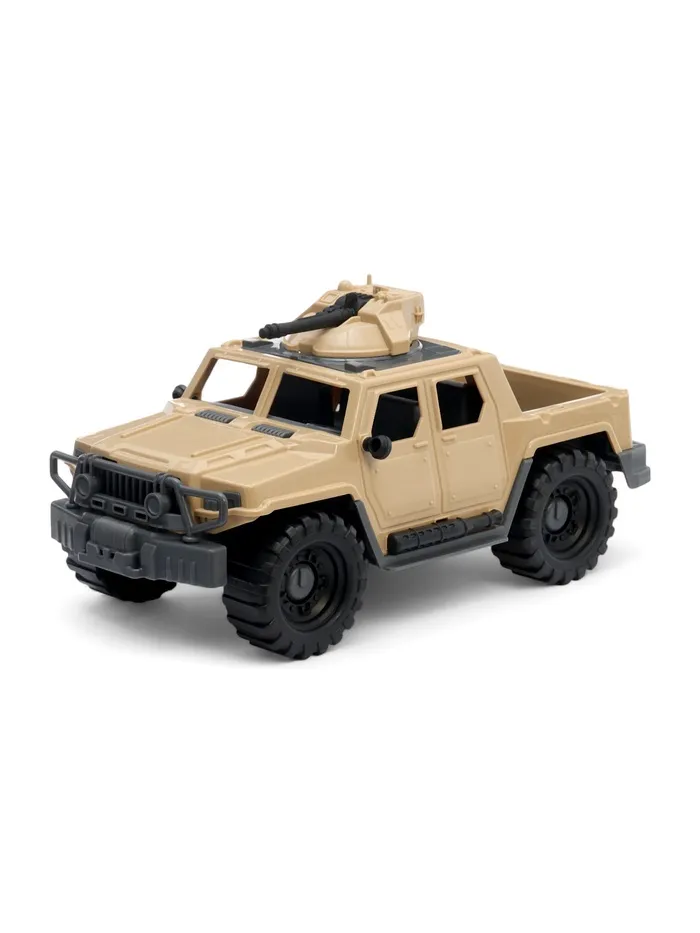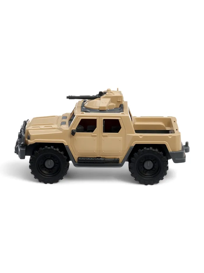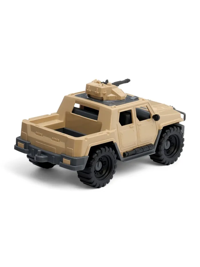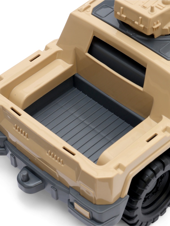 - Аутентичный военный дизайн: джип выполнен в защитном песочном цвете с детализированным кузовом и крупными колёсами. Форма машины повторяет черты настоящего армейского внедорожника.