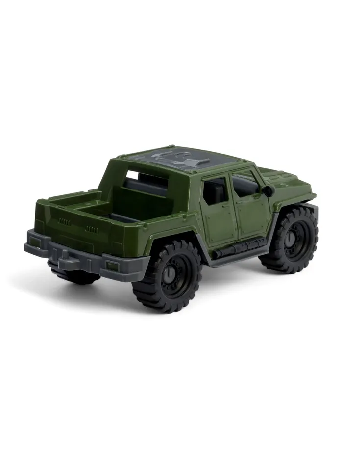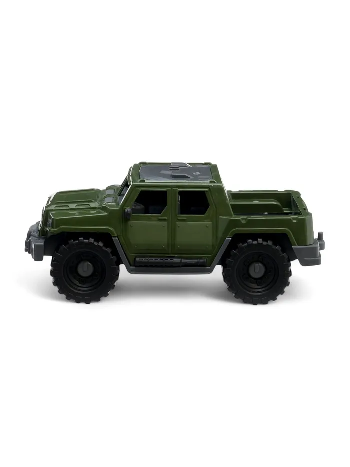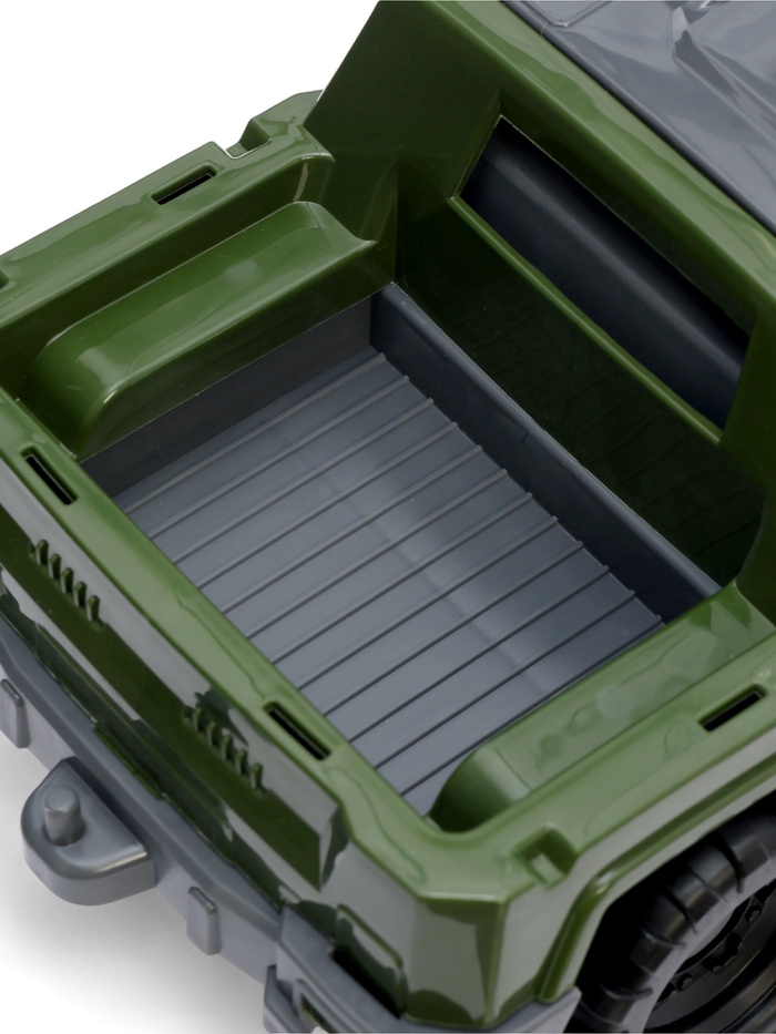 - Аутентичный военный дизайн: машина выполнена в защитном зелёном цвете с детализированным кузовом и выраженной решёткой радиатора. Крупные колёса с протектором добавляют сходства с реальным внедорожником.