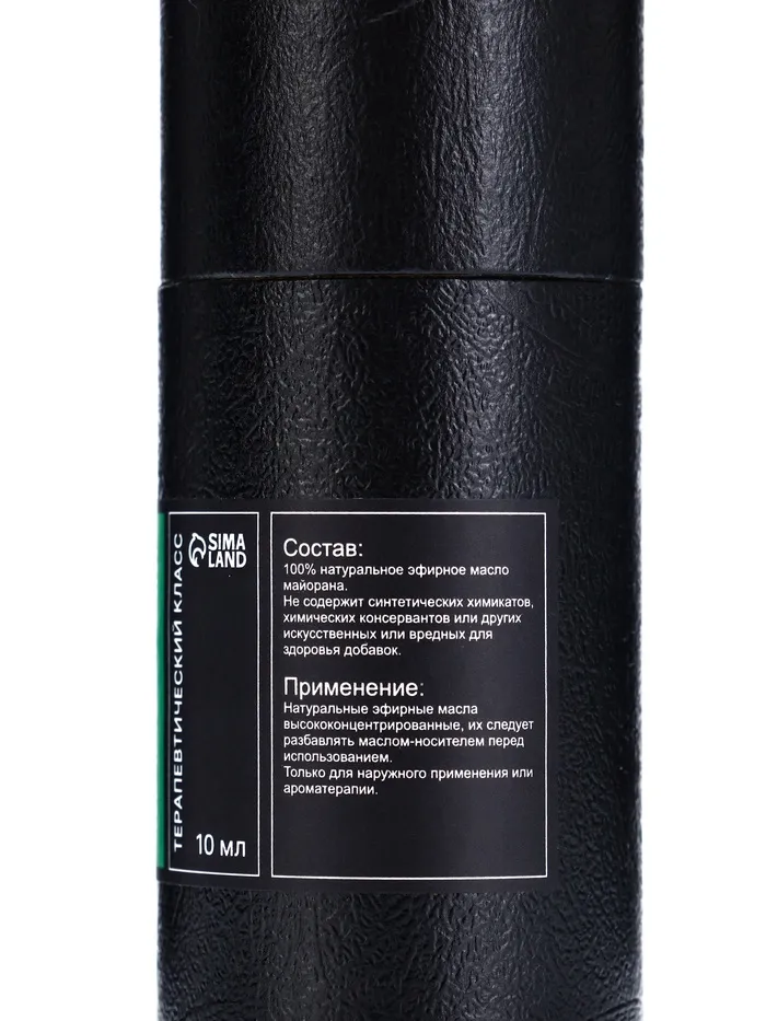 Уникальная упаковка: Масло "Майоран" поставляется в элегантном тубусе, который подчеркивает его натуральность и утонченность. Такая упаковка удобна для хранения и использования, а также станет красивым акцентом в вашем интерьере. Герметичная упаковка помогает сохранить все полезные свойства масла на протяжении долгого времени.
