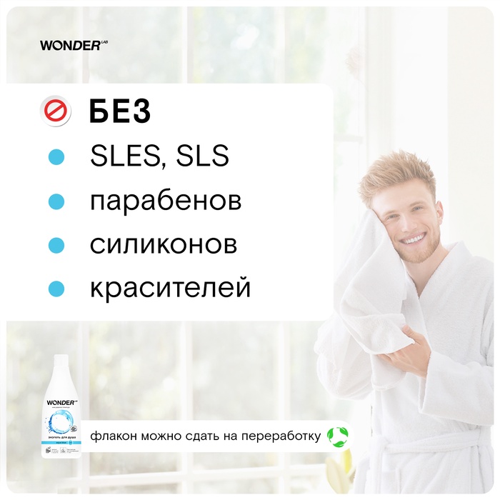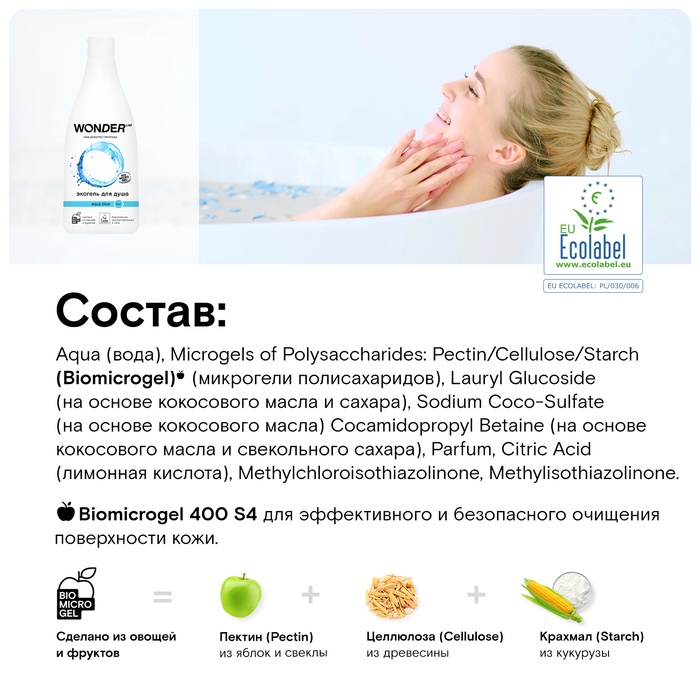 Гель для душа и другие экосредства WONDER LAB созданы на основе инновационного компонента Biomicrogel, который сделан из овощей и фруктов. Средства WONDER LAB не вредят окружающей среде, не содержат опасных компонентов и разлагаются на 98% за 1 день.