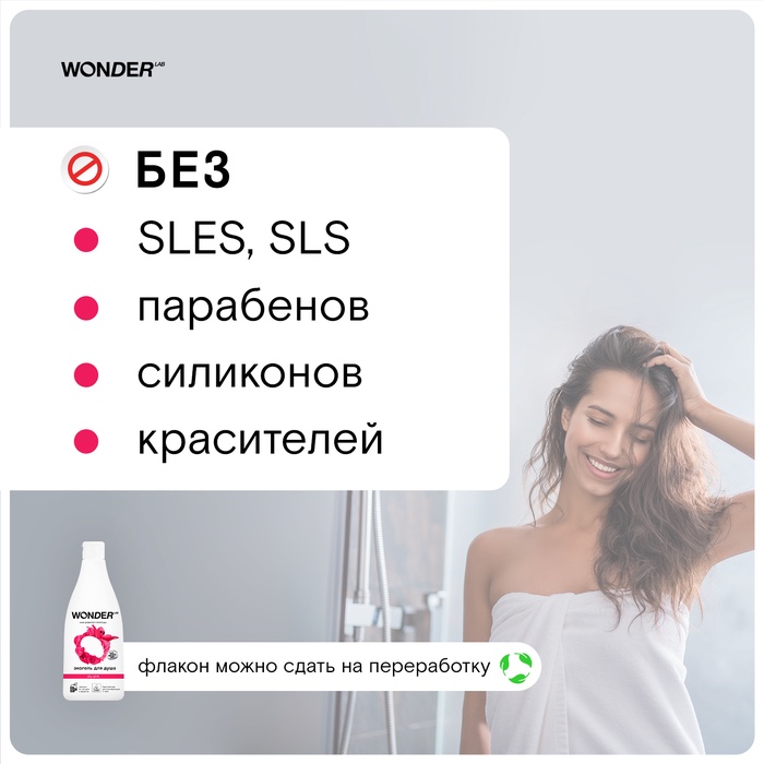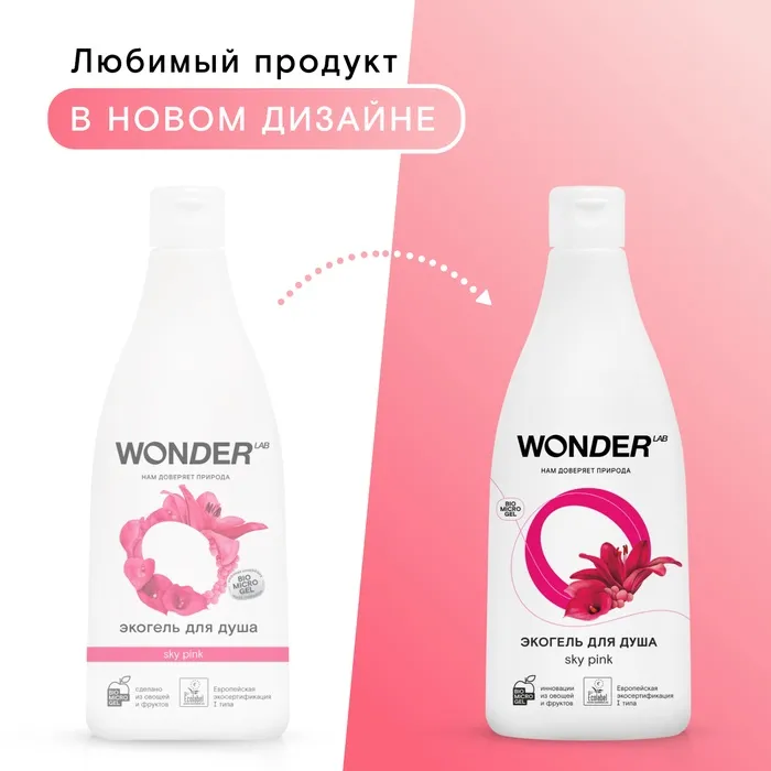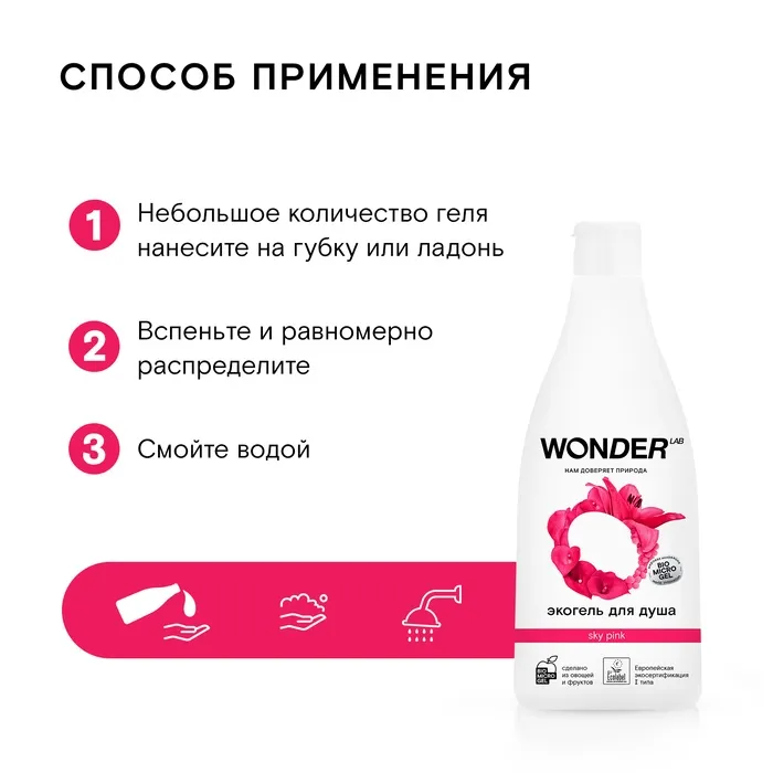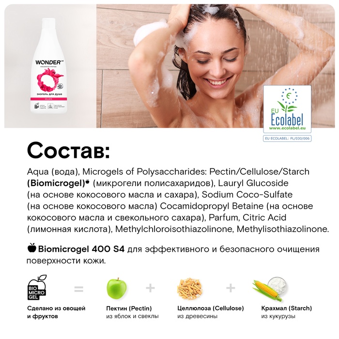 Гель для душа и другие экосредства WONDER LAB созданы на основе инновационного компонента Biomicrogel, который сделан из овощей и фруктов. Средства WONDER LAB не вредят окружающей среде, не содержат опасных компонентов и разлагаются на 98% за 1 день.