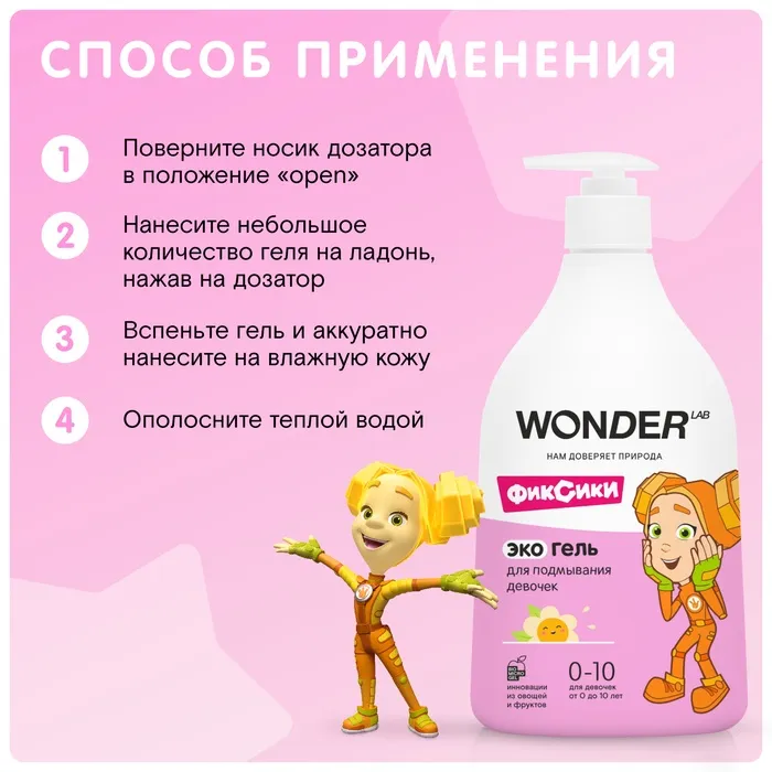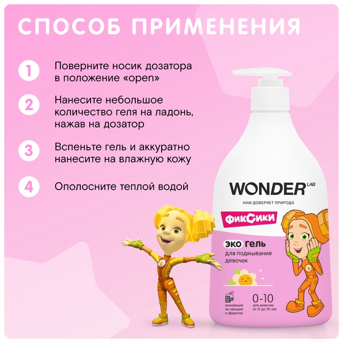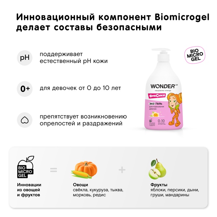 Экогель для подмывания девочек WONDER LAB имеет уникальную формулу на основе инновационного компонента Biomicrogel из овощей и фруктов.