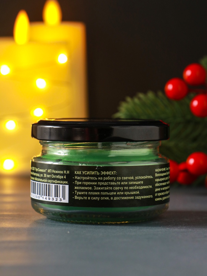 Зелёная ритуальная свеча для привлечения финансовой энергии. Создана из натурального воска для ваших практик изобилия. Горит до 14 часов, помогая сфокусировать намерение на денежном потоке.