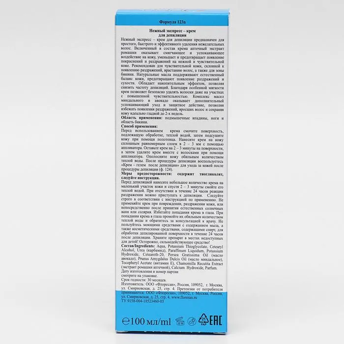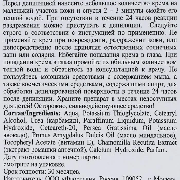 Перед депиляцией нанесите небольшое количество крема на маленький участок кожи и спустя 2 – 3 минуты смойте его теплой водой. При отсутствии в течение 24 часов реакции раздражения можно приступать к депиляции.