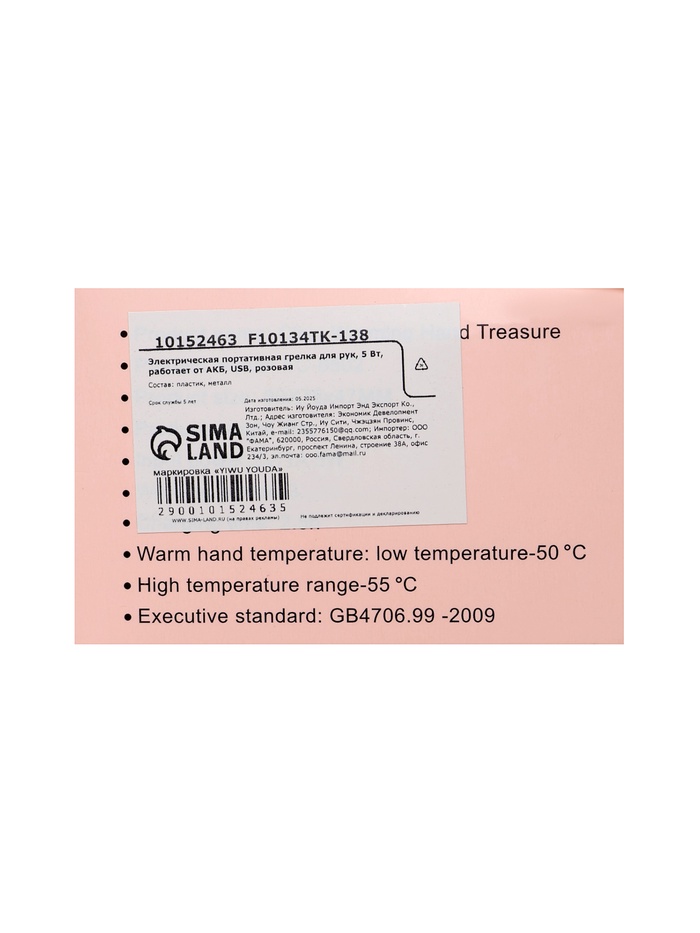 Электрическая портативная грелка для рук, 5 Вт, АКБ, 800 мАч, до 55 °С, USB, розовая — Характеристики