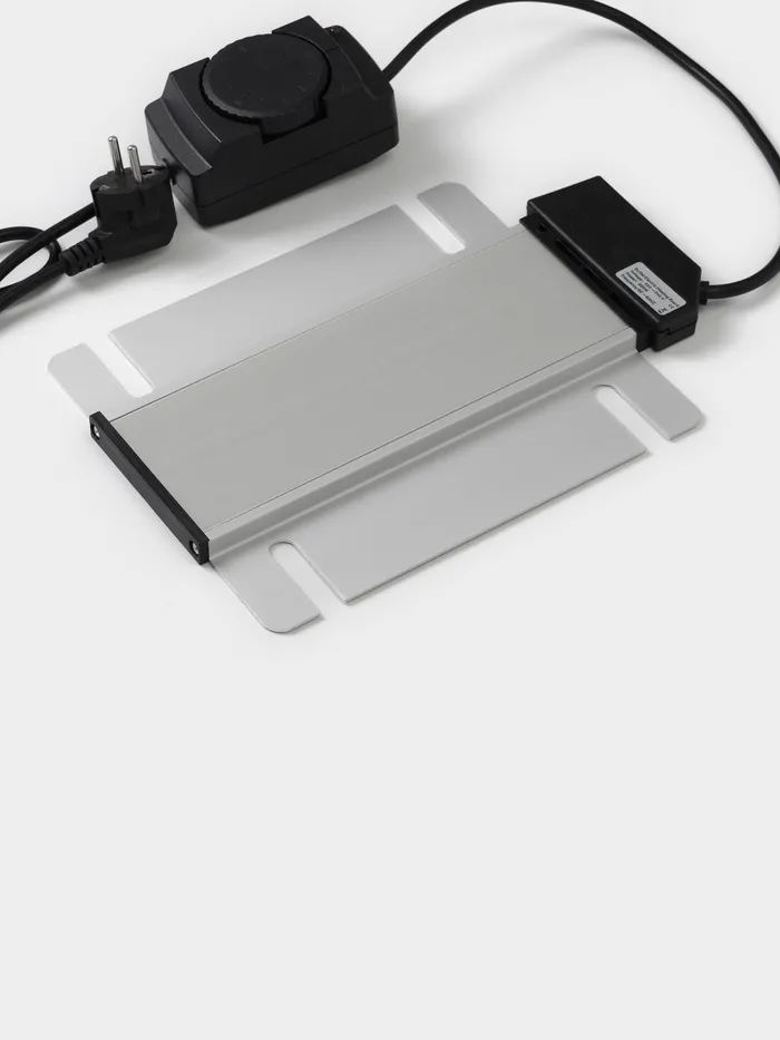 Изготовленный из высококачественного алюминия, нагреватель отличается элегантным серебристым цветом и гарантирует долговечность. Его продуманный дизайн и компактные размеры делают его идеальным выбором для любого кухонного пространства.