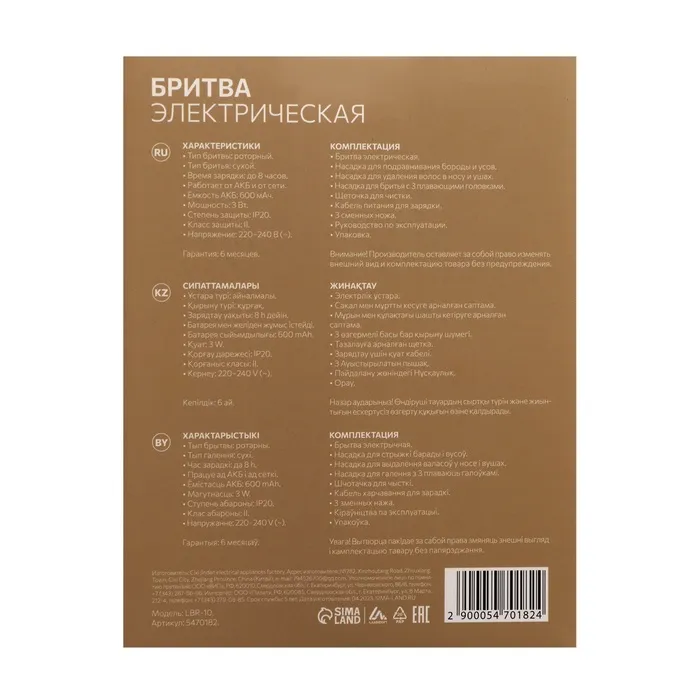 Электробритва Luazon LBR-10, 3 Вт, роторная, 3 головки, сухое бритьё, триммер, от АКБ/220 В — Характеристики