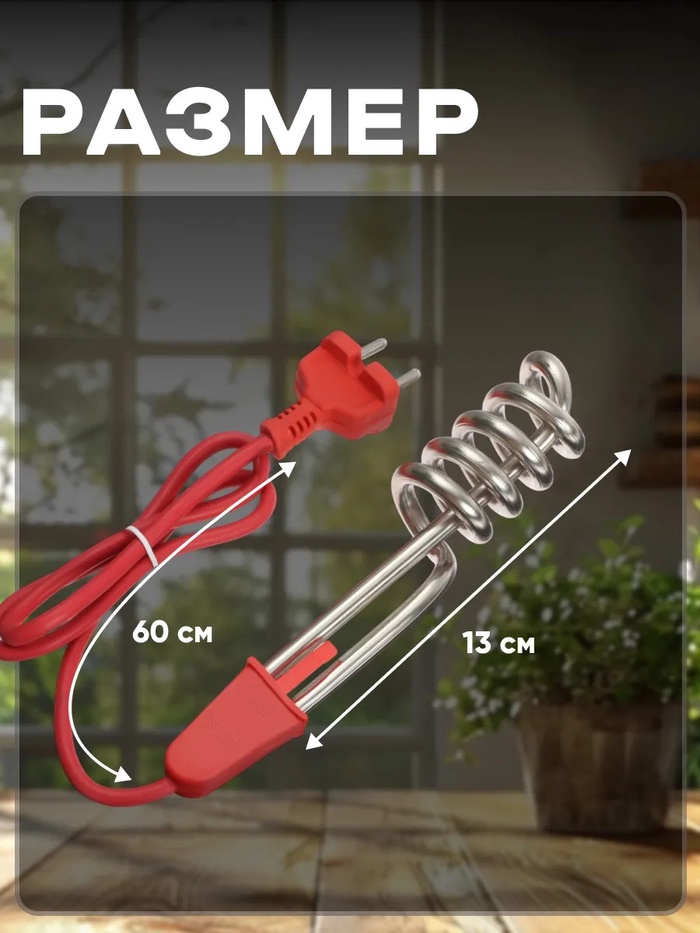 Шнур длинной 60 см даёт возможность использовать устройство подальше от стен, тем самым обезопасив вас от пожароопасной ситуации в процессе нагрева воды. В процессе использования держите кипятильник за ручку, она выполнена из термостойкого пластика.
