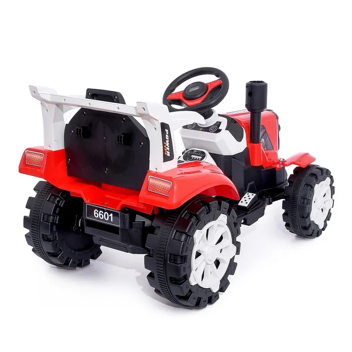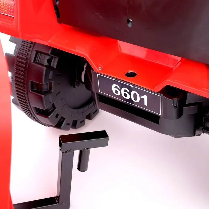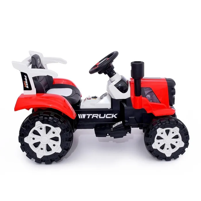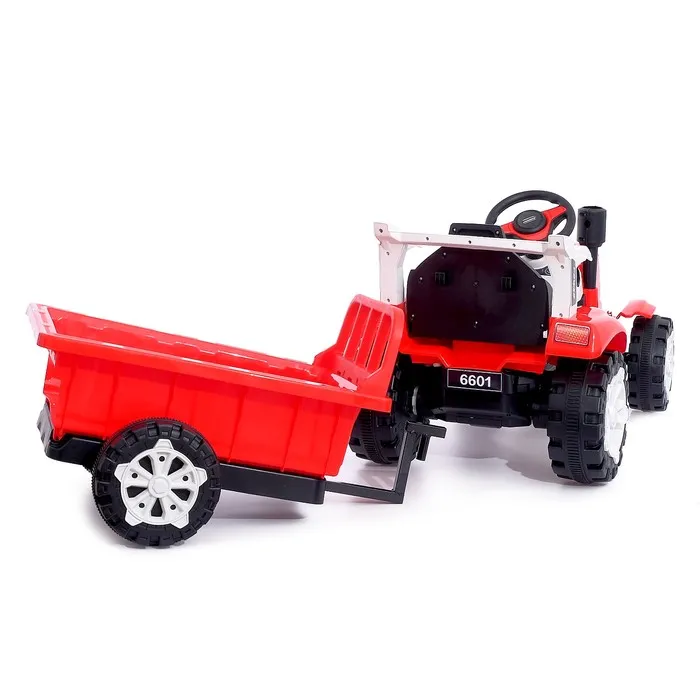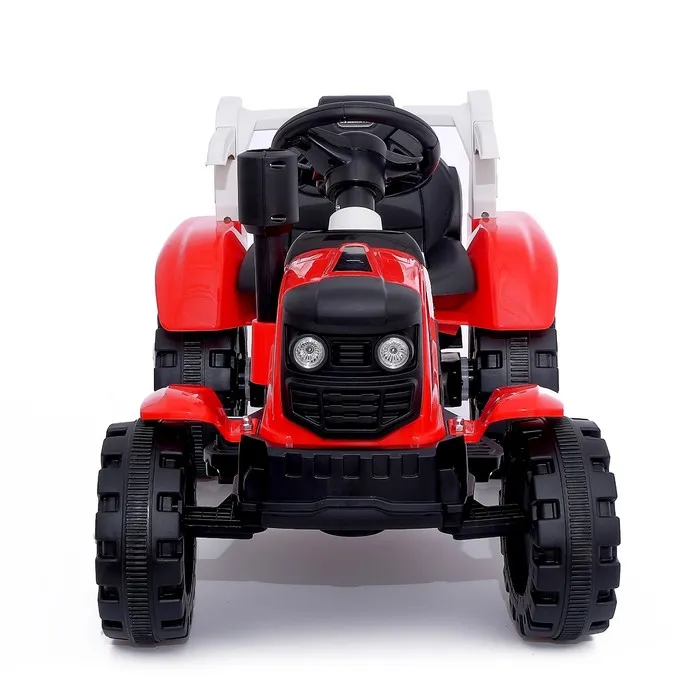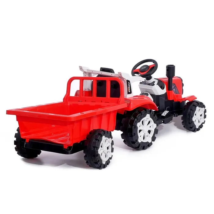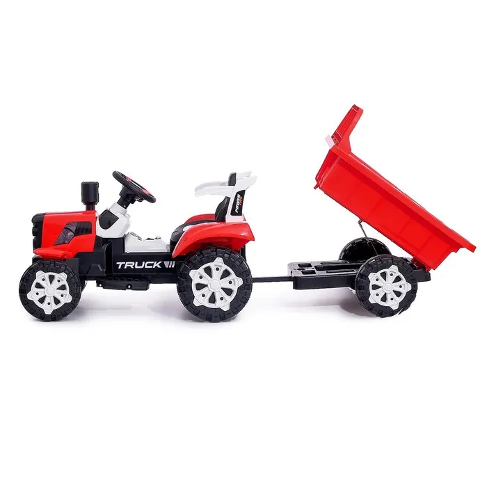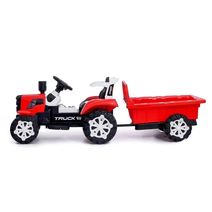 Красный электромобиль-трактор с прицепом — отличный выбор для маленьких водителей. Компактная машинка на аккумуляторе готова к увлекательным приключениям во дворе или парке.
