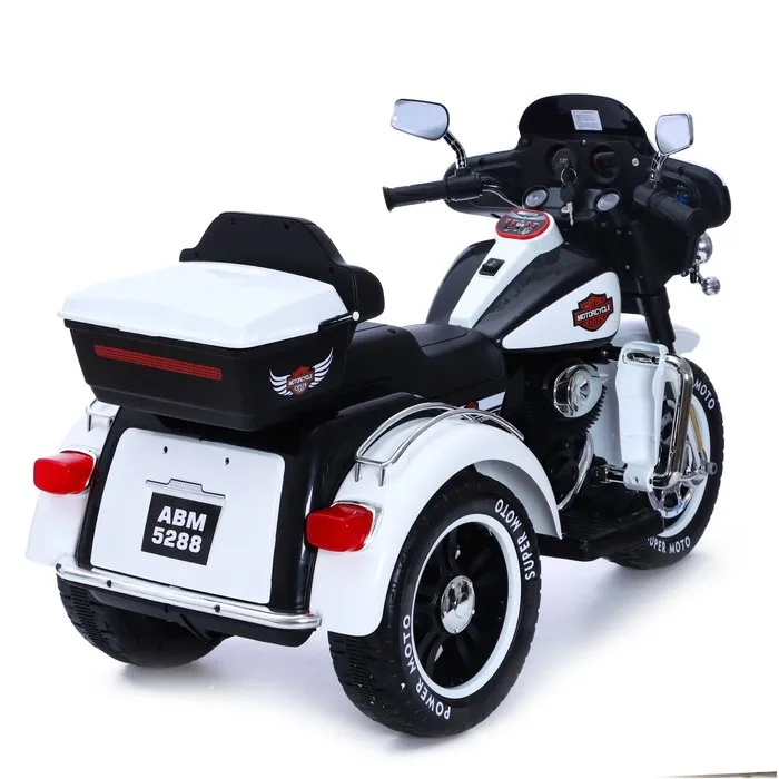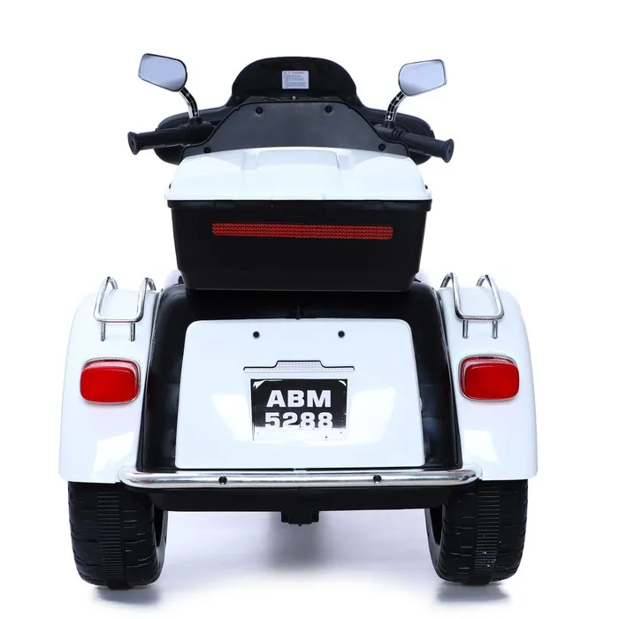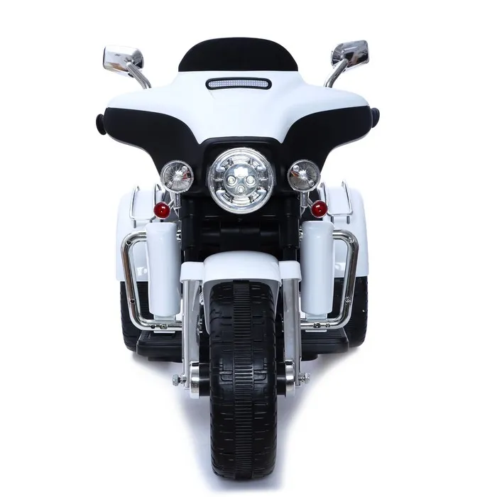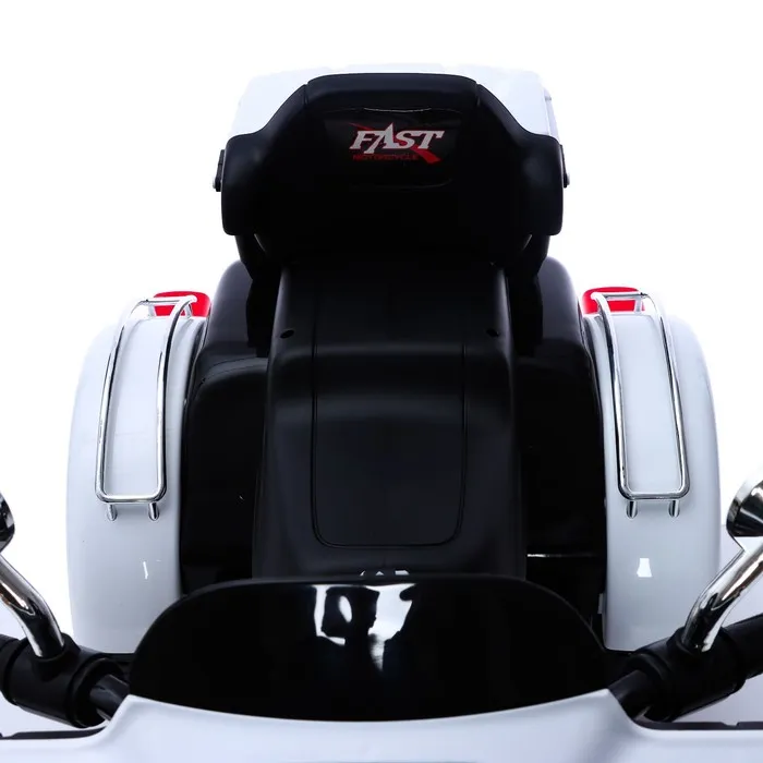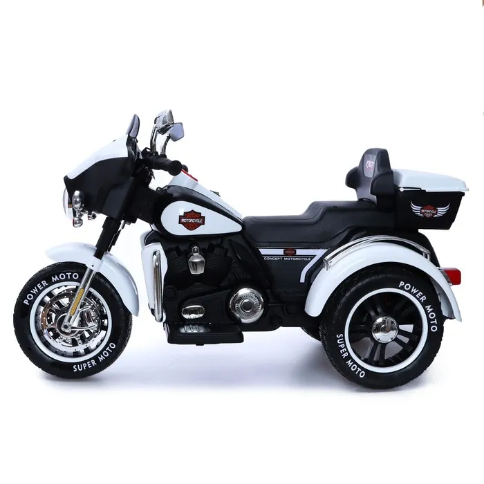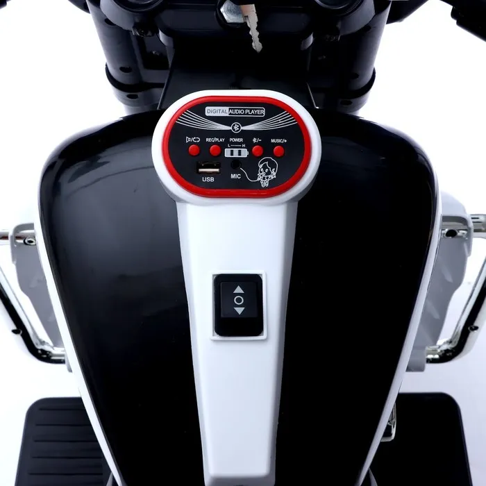 Садитесь за руль стильного трайка! Чёрно-белый двухместный электромотоцикл – это игрушка, которая перенесёт вашего ребёнка в мир приключений на колёсах.