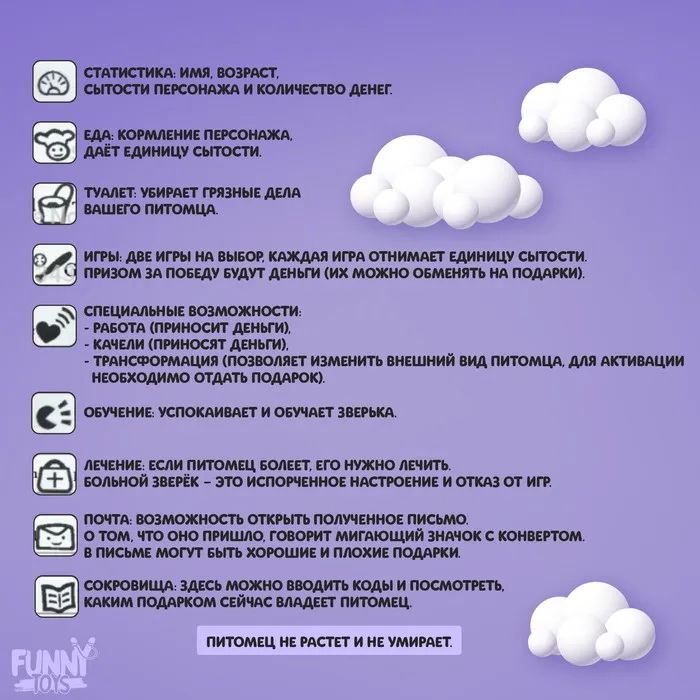 Она работает по принципу тамагочи. Нужно выбрать одного из 49 животных, и персонаж появится на экране. У каждого из них свой характер и потребности. Если хозяин хорошо заботится о животном, оно будет постепенно расти.