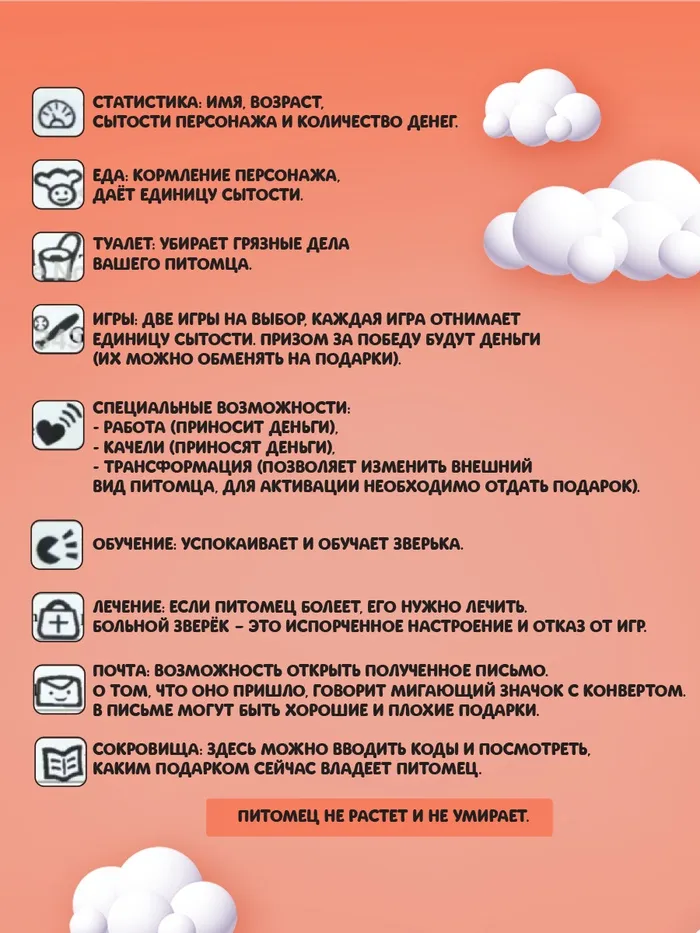 Игрушка позволяет заботиться о виртуальном друге: кормить, развлекать и следить за его состоянием. Для этого нужно вовремя реагировать на его запросы и участвовать в интерактивной мини-игре. Удобное управление и понятный интерфейс делают процесс приятным и лёгким.