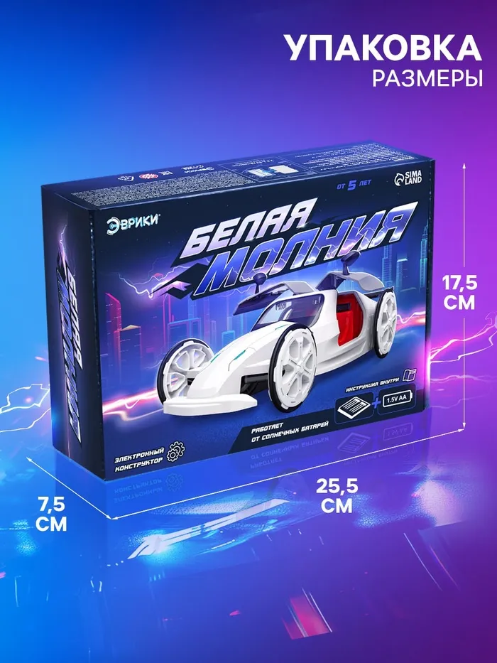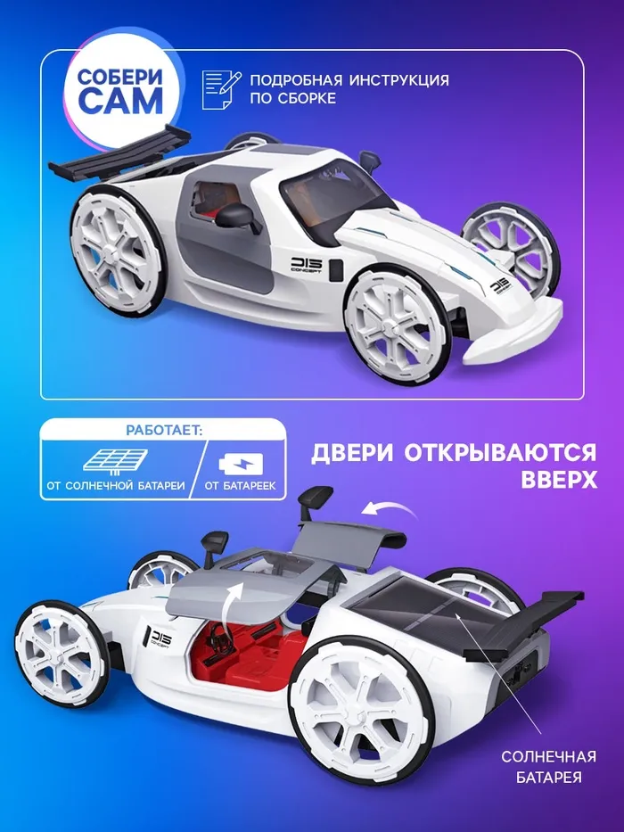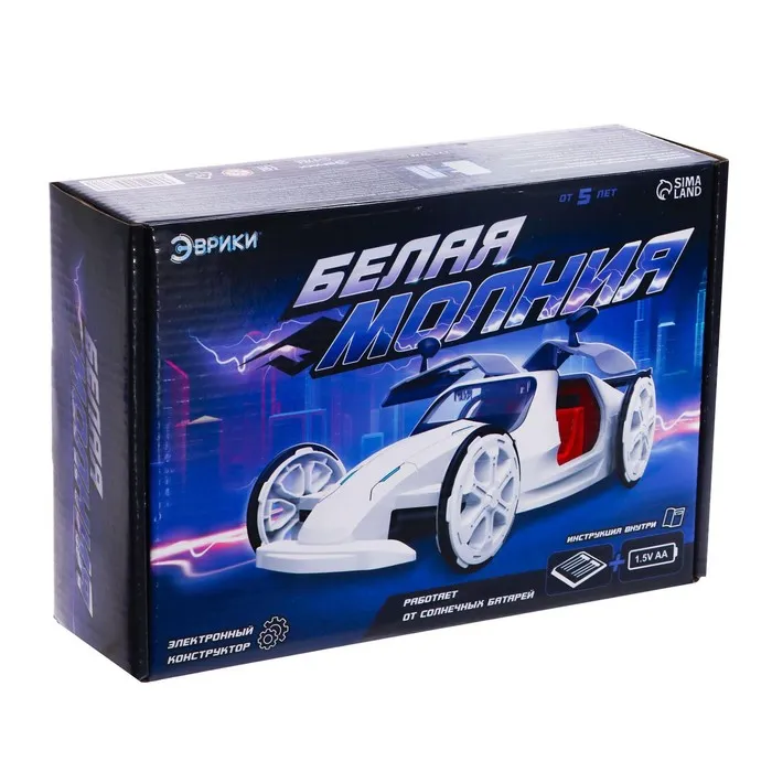 Удивите вашего будущего учёного необычной игрушкой! Яркая высококачественная модель станет отличным подарком на любой праздник. «Белая молния» поможет узнать много интересного, познакомит с современной механикой и электроникой. А главное — машинка работает от двух видов источников энергии: солнечной батареи или двух батареек типа AA.