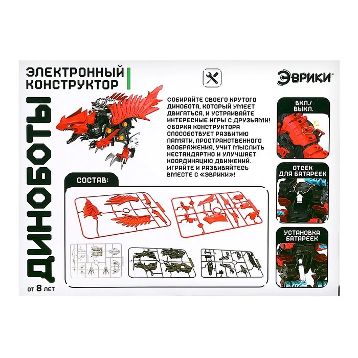 С электронным конструктором ребёнок соберёт могучего динозавра и освоит основы робототехники. Набор объединяет сразу три игрушки: конструктор, динозавра и робота. Конструктор понравится любителям собирать модели и оживлять их. Ведь динобот оснащён электродвигателем, а внушительный внешний вид древней рептилии никого не оставит равнодушным!