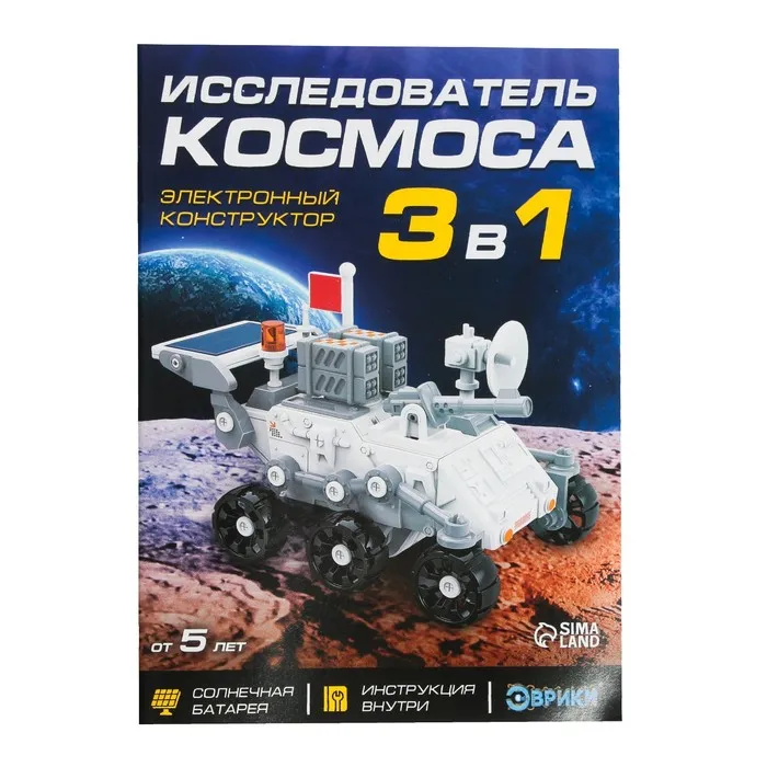 С электронным конструктором юный космонавт соберёт одну их трёх машин и станет исследователем межгалактических пространств! Собранная модель работает от солнечной батареи. Ребёнок сможет играть на свежем воздухе и дома. Для игры на улицы подойдёт солнечная ясная погода, а чтобы играть дома, используйте искусственный источник освещения.