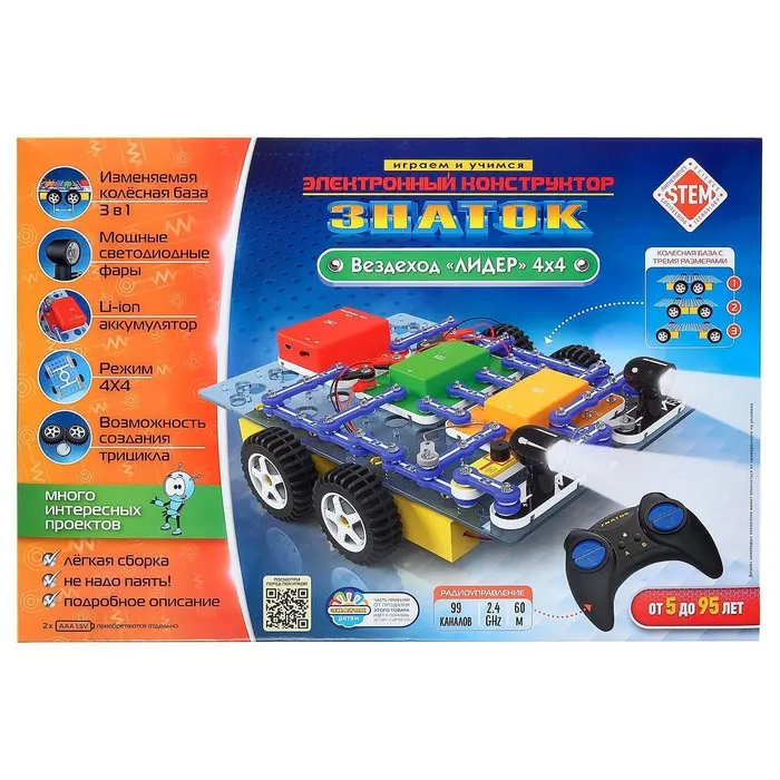 Электронный конструктор, являющийся логическим развитием предыдущих электронных конструкторов ЗНАТОК. В данный набор введены совершенно новые элементы и детали. Теперь электрическими схемами можно управлять на расстоянии при помощи пульта дистанционного управления, работающего на частоте 27 МГц. Рекомендован для детей от 8-ми лет.