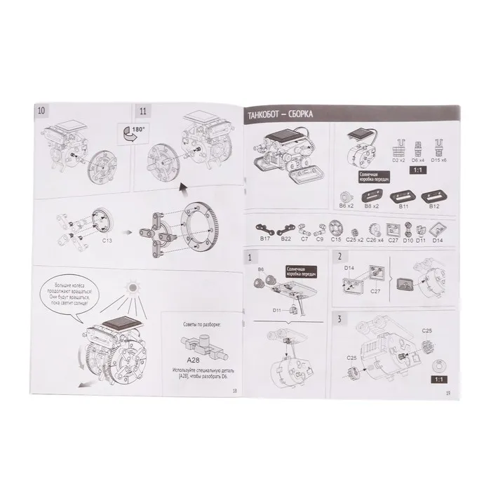 Собранные модели могут двигаться на ровной поверхности от действия солнечного или яркого электрического света. Будьте внимательны: при пасмурной погоде и люминесцентном освещении батареи не работают.