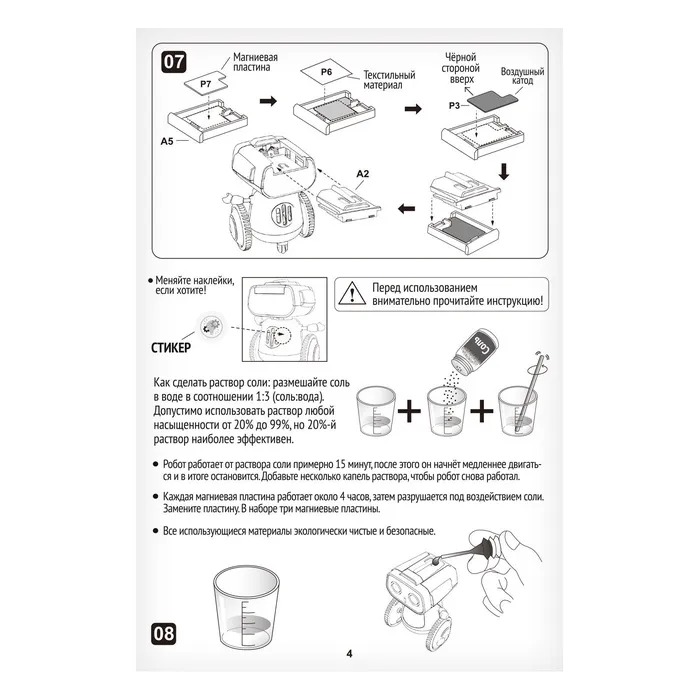 Обратите внимание! Робот работает от раствора соли примерно 15 минут. После этого он начнёт медленнее двигаться и в итоге остановится. Добавьте несколько капель раствора чтобы робот снова работал.