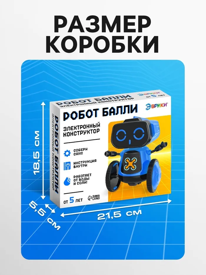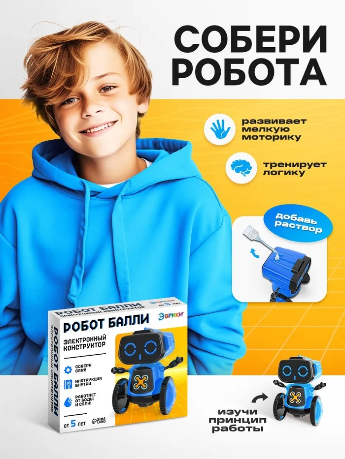 С электронным конструктором юный инженер соберёт робота «Балли» Собранная модель работает от воды солью — ребёнок научится смешивать лёгкий электролит.