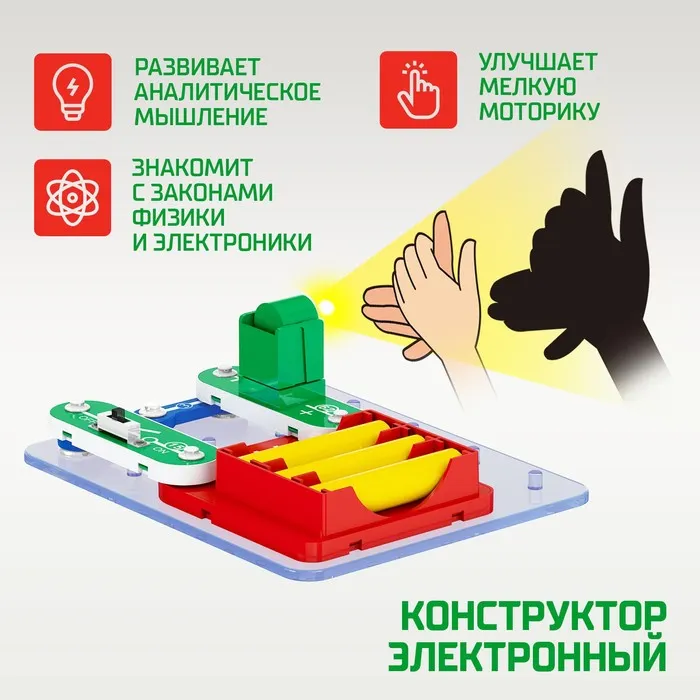 Сделайте обучение интересным и весёлым с электронным конструктором «Шоу теней». Ребёнок создаст электрическое устройство самостоятельно, без помощи взрослых! Все электрические цепи просты и понятны, легко собираются с помощью специальных кнопочных креплений, не требуют настройки и начинают работать сразу.