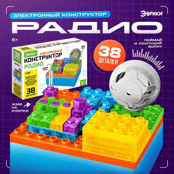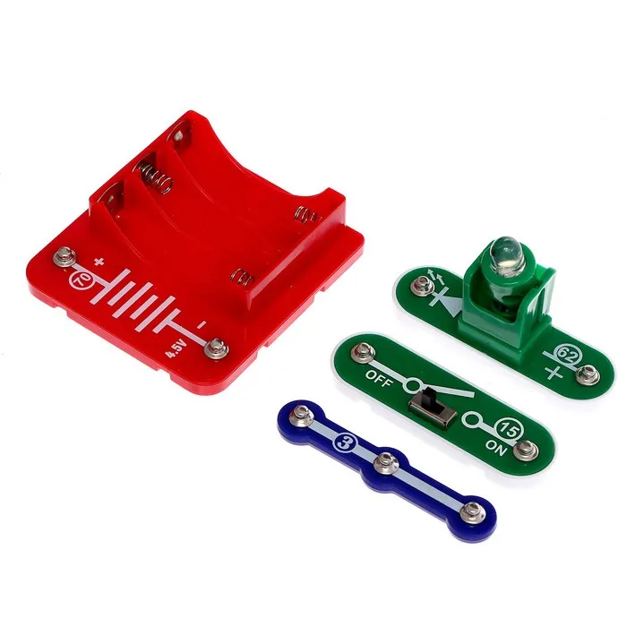 - В электронном конструкторе необходимо использовать батарейки 1,5 В. Такое напряжение безопасно для человека. Поэтому ребёнок сможет самостоятельно играть с набором, а вы — не переживать о его безопасности.