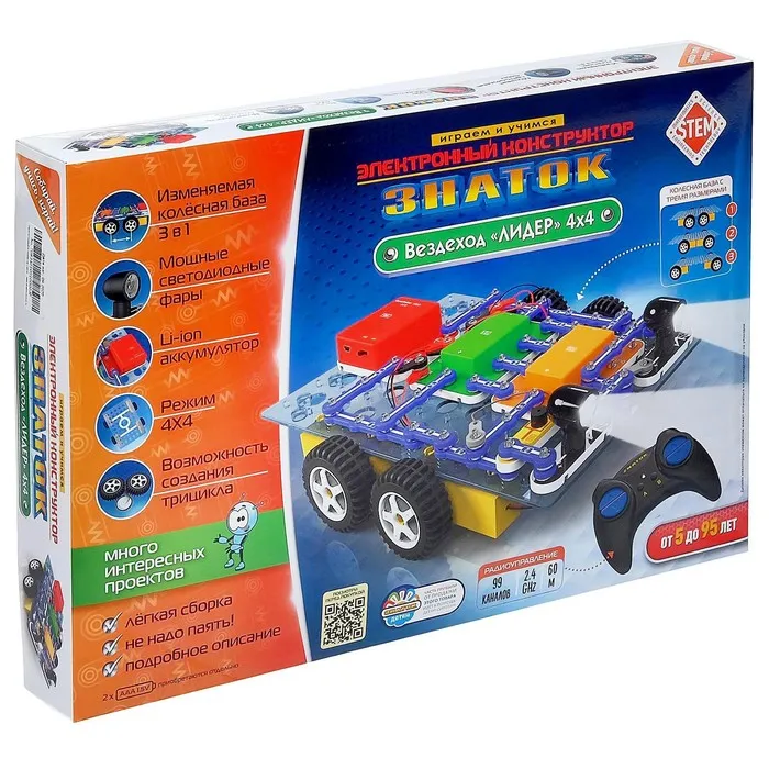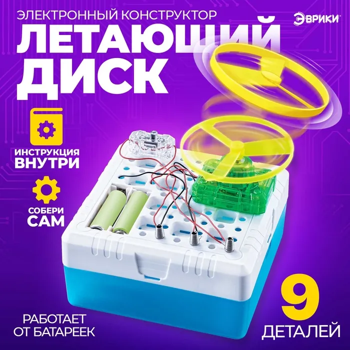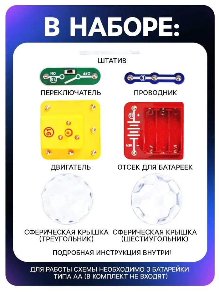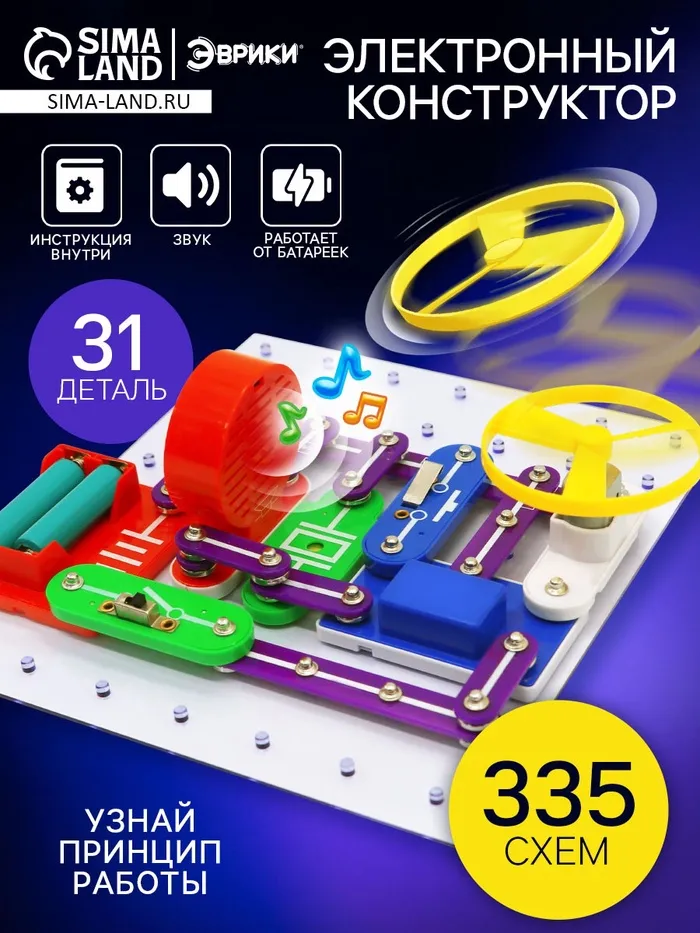 - В электронном конструкторе необходимо использовать батарейки 1,5 В. Такое напряжение безопасно для человека. Поэтому ребёнок сможет самостоятельно играть с набором, а вы — не переживать о его безопасности.