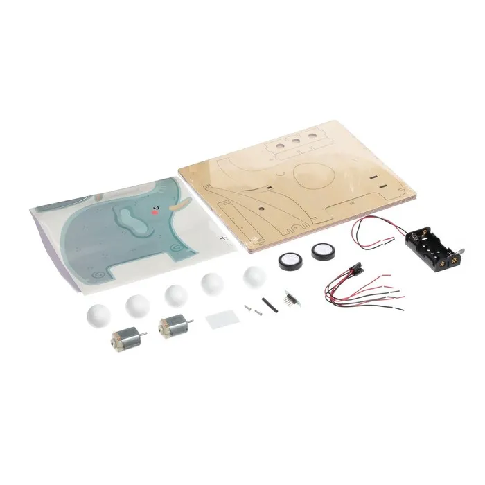 - Подвижная игрушка: из 26 деревянных и пластиковых деталей собирается забавный слон. После подключения батареек модель начинает двигаться, демонстрируя простые механические принципы.