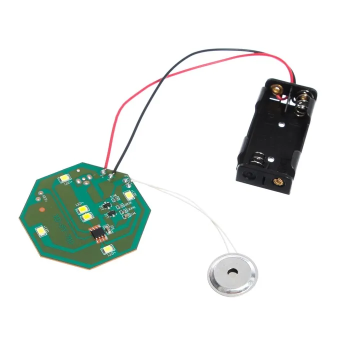 В электрической цепи есть микрофон, он улавливает звуки, преобразует их в электрический сигнал и передаёт на плату управления. Это позволяет включать и выключать лампочки.