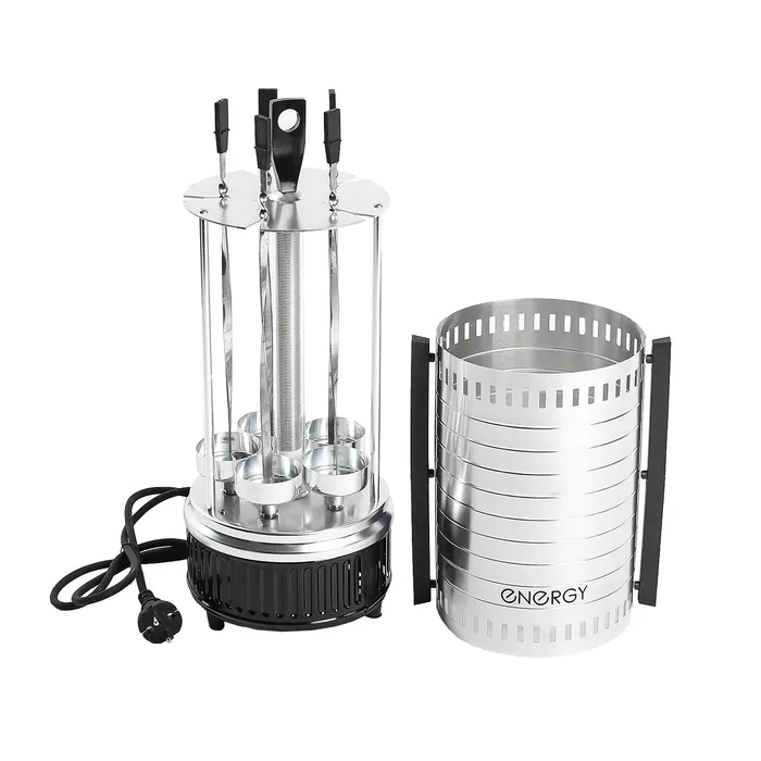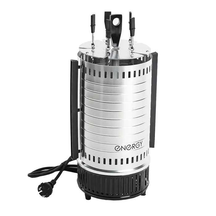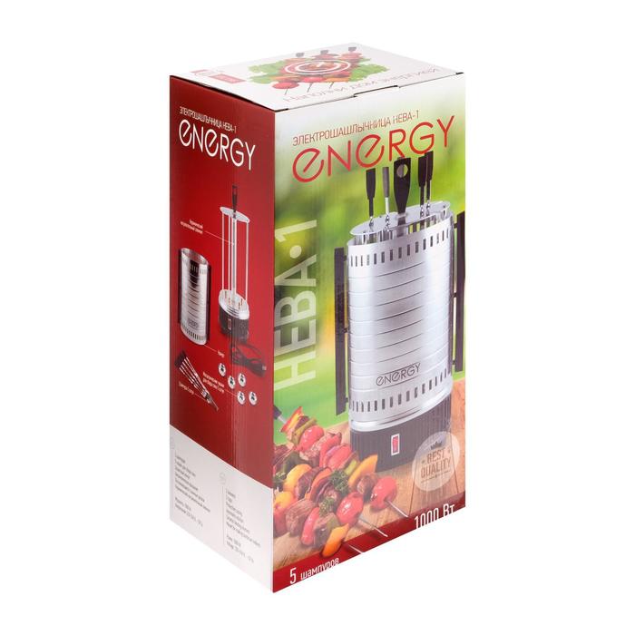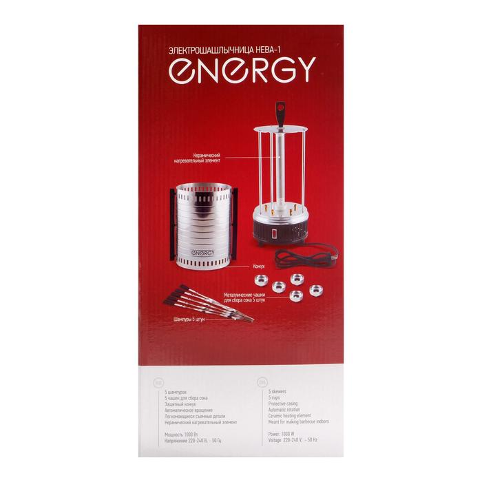 Электрошашлычница ENERGY НЕВА-1 представляет собой цилиндрический корпус, в котором размещена жаровая камера с нагревательным элементом, защищённым стеклянной трубой. В эту камеру в вертикальном положении устанавливают шампура. За раз можно поместить до 5 штук.