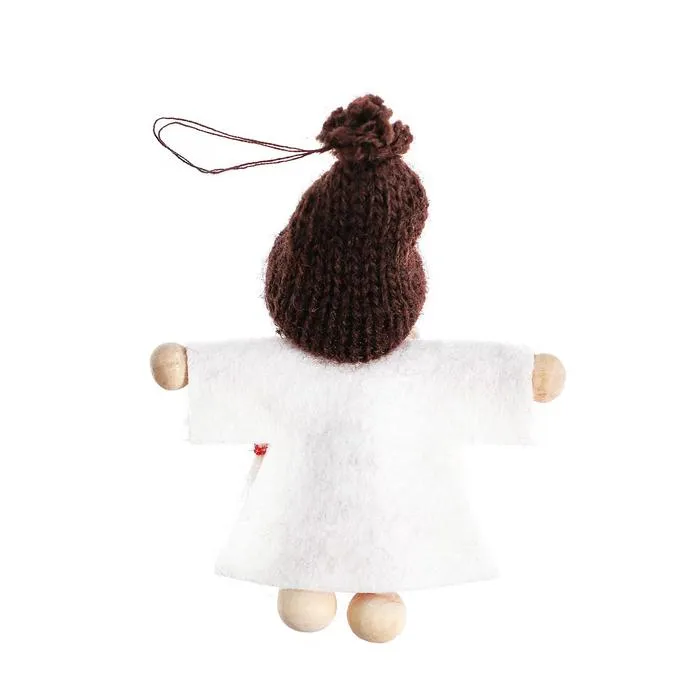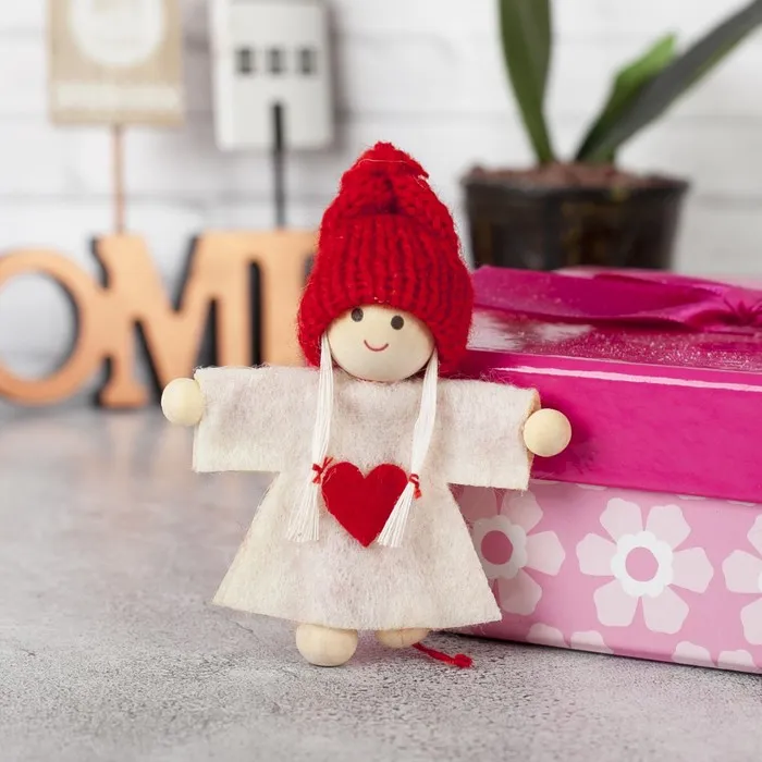 Интерьерная подвеска выполнена в виде миниатюрной куколки в зимнем наряде.