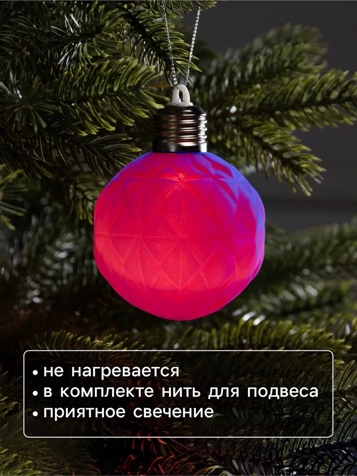 Изготовленный из высококачественного пластика, шар отличается легкостью и прочностью. Он оснащен светодиодом, который излучает тёплое белое свечение, создавая уютную и волшебную атмосферу. Питание от трех батареек LR44 обеспечивает полную автономность, позволяя вам разместить украшение в любом уголке вашего дома, не беспокоясь о проводах.