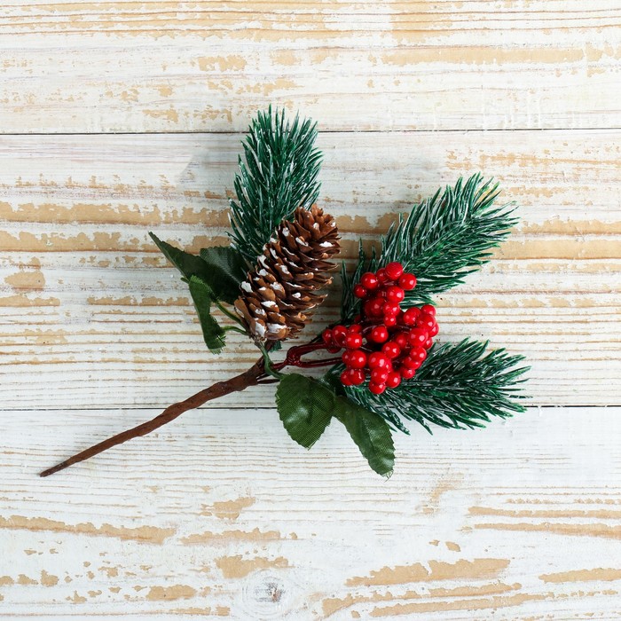 Еловая ветка декоративная «Зимнее волшебство. Чудо», ягодки, шишка, хвоя, 19 см — Характеристики