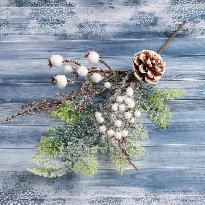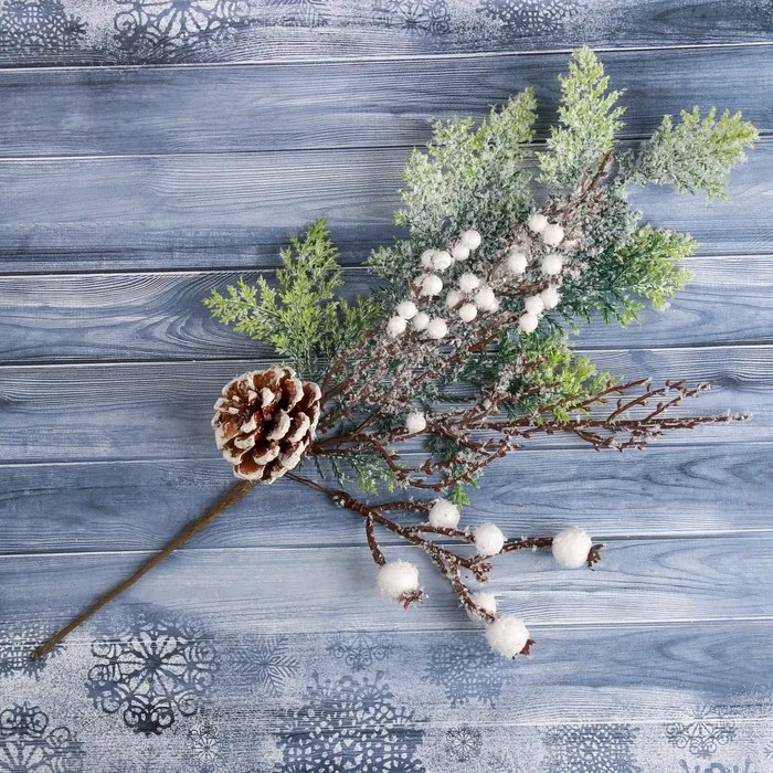 Эта ветка добавляет дереву и дому ощущение покоя и семейного уюта. Белые тона и форма шишек работают вместе, чтобы сделать пространство частью вашей личной зимней истории. Используйте её как основной акцент или фоновое дополнение — одинаково хорошо усиливает дух торжества и доброжелательность дома.