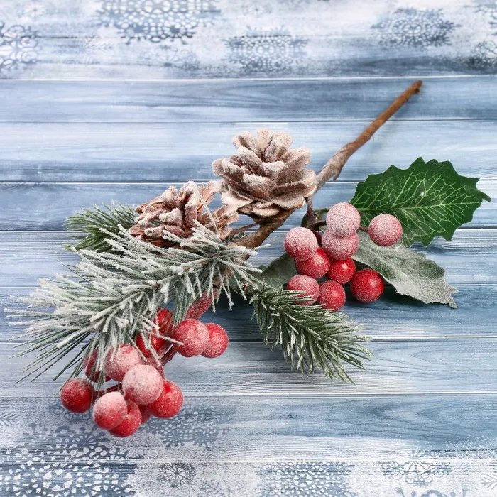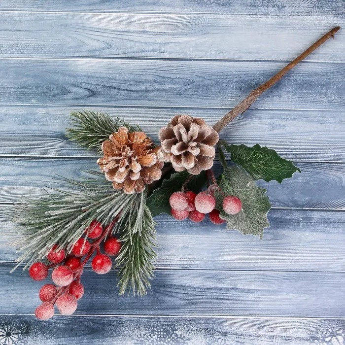 - Тип — декоративная ветка, используется как самостоятельный акцент или как часть зимней композиции на Новый год.