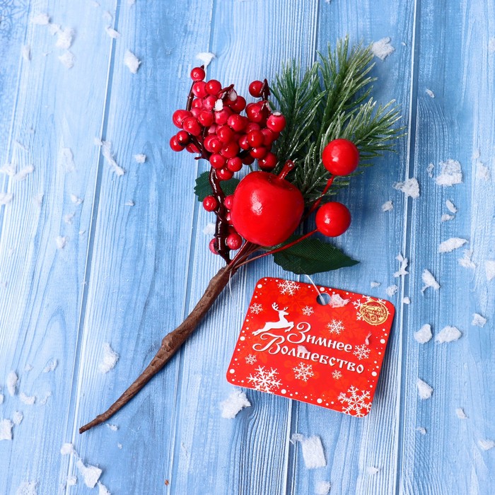 Новогодняя еловая ветка «Грёзы» — это стильный и доброжелательный акцент для зимнего декора. Изделие длиной 17 см выполнено из пластика и украшено элементами в виде яблока и красной калины. Цветовая гамма — зелёный и красный, сочетание, напоминающее классические мотивы Нового года. Декор создан в духе новогоднего барокко с отсылкой к скандинавской простоте — решение для тех, кто ценит свет, форму и атмосферу праздника.