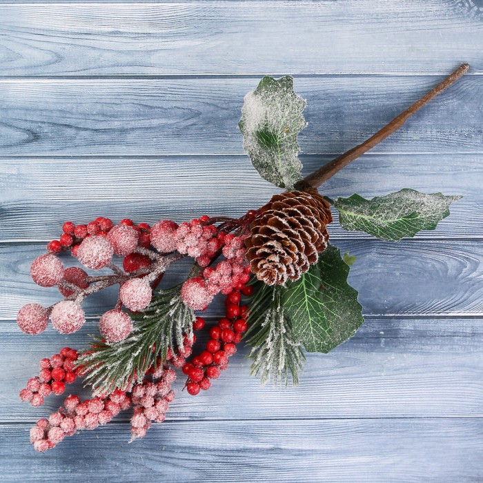 Еловая ветка декоративная «Зимнее волшебство. Грёзы», ягоды, шишка, иней, хвоя, 26 см — Характеристики